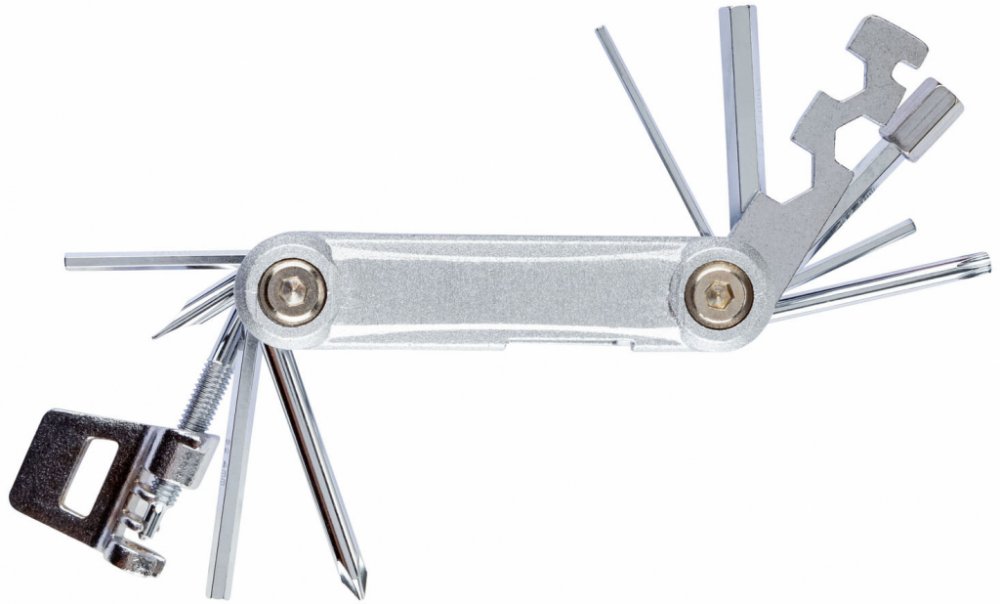 Minipumpička Z pevného a lehkého hliníku Vhodná pro galuskový, německý a auto ventil Odnímatelná hadice na pumpování – uložení v krytu pro úsporu místa Včetně stabilního umělohmotného držáku s páskem na suchý zip Nářadí na jízdní kolo 16 funkcí Praktický obal s poutkem na opasek Nástroje z chrom-vanadiové oceli a tvrzené nástrojové oceli Obsah: 1x křížový šroubovák 7x inbus: 2/2,5/3/4/5/6/8 mm 1...