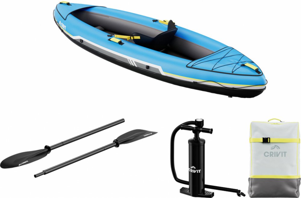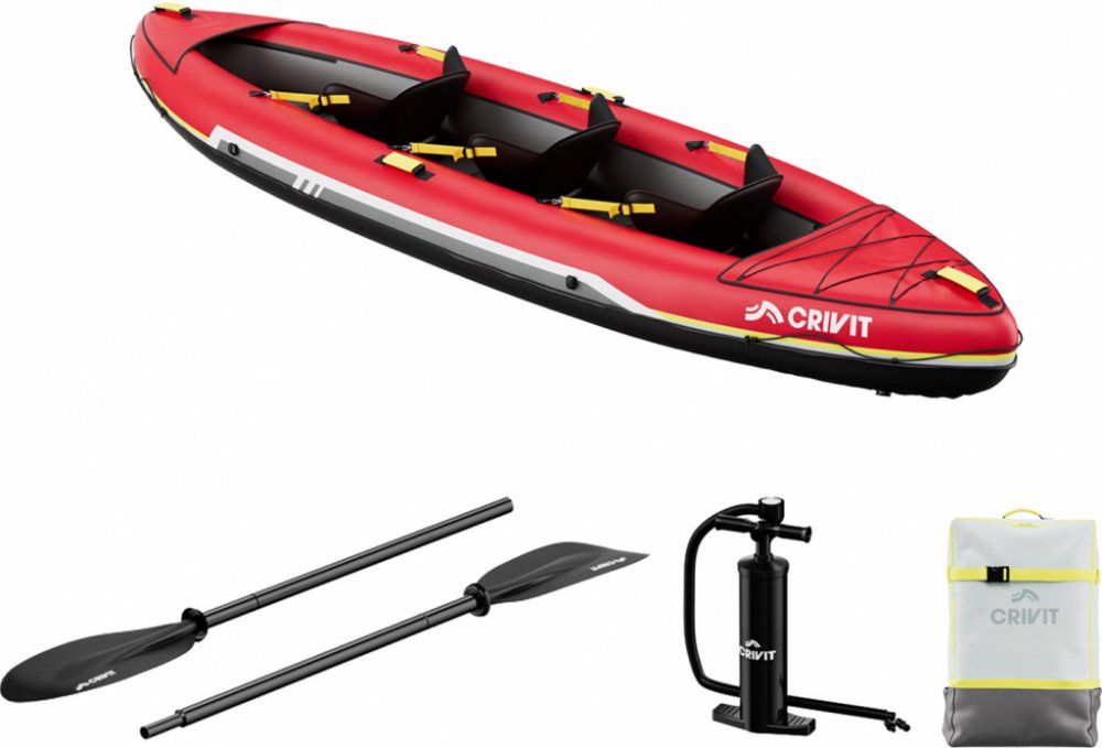 Crivit® Nafukovací kajak Touring, 3místný Kajak stabilní proti převrácení; ideální pro příležitostné výlety ve dvojici nebo trojici Zvýšené sedadlo pro větší pohodlí při pádlování Plocha se suchým zipem na podlaze pro individuální posunutí nebo snadné vyjmutí sedadel Nastavitelné pásy drží sedadla ve správné poloze Dvě 4dílná pádla (cca 2,4 m) Systém 2 ploutví pro optimální plavbu Vysoce kvalitní 3komorový vzduchový systém pro vyšší bezpečnost a stabilitu Široké a nafukovací dno pro větší vztlak a tím zvýšenou stabilitu Robustní; odolný materiál – odolávající slané vodě, olejům, ozónu i chladu Snadná přeprava díky kompaktní velikosti balení a praktickému batohu Dva praktické držáky pádel na suchý zip na každé straně Praktická síť na zavazadla umožňuje bezpečnou přepravu vybavení Držadlo pro jednoduchou přepravu nafouknutého kajaku Příslušenství: 2x dvojité pádlo 1x pumpa s dvojitým zdvihem 1x batoh 2x zásuvné ploutve 1x opravná sada 3x sedačka do kajaku Počet osob: max. 3 Max. nosnost: cca 230 kg Odpovídá ISO 6185-1, kategorie Iii, typ B Pádlo podle EN 16083 – koupání/rekreační použití Pro použití v chráněných pobřežních vodách; do vzdálenosti cca 300 m od břehu Na jízdy v chráněných vodách blízko pobřeží; v malých zátokách; na malých jezerech, úzkých řekách a kanálech Technické údaje Max. tlak vzduchu: 0,1 bar (1,5 psi) Rozměry Kajak (nafouknutý): cca 3,82 x 1,08 m (D X Š) Pádlo: délka: cca 2,4 m Po sbalení: batoh: cca 48 x 34 x 77 cm Hmotnost cca 19,9 kg (kompletní souprava)