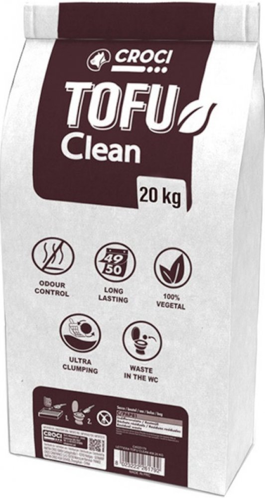 Co byste řekli na stelivo do kočičí toalety, které je nejen extrémně savé, ale také udržitelné? Inovativní stelivo pro kočky Croci Tofu Clean je vyrobeno na bázi sóji. Přírodní zrna rostlinných vláken tvoří pevné hrudky, které lze z kočičí toalety snadno odstranit. Nejenže spolehlivě absorbuje tekutiny, ale také účinně potlačuje nepříjemné pachy! Složení steliva pro kočky Croci Tofu Clean s nízkým obsahem prachu a bez chemikálií je obzvláště šetrné k vašim dýchacím cestám a samozřejmě i k dýchacím cestám vašeho mazlíčka. Stelivo je navíc příjemně jemné k citlivým kočičím tlapkám. Mimochodem, věděli jste, že spotřebované stelivo můžete jednoduše zlikvidovat do zahradního kompostu nebo do toalety? Je totiž zcela biologicky rozložitelné! Stelivo pro kočky Croci Tofu Clean: Podestýlka do kočičí toalety, šetrná k životnímu prostředí Na bázi sóji: savá zrna rostlinné vlákniny, 100% přírodní Tvoří hrudky: pro rychlé a bezproblémové čištění kočičí toalety Bio certifikované: vynikající ekologická alternativa Vysoká savost: spolehlivě absorbuje tekutiny Výkonná kontrola zápachu: zabraňuje tvorbě čpavku, pro svěží atmosféru v místnosti Šetří podlahu a tlapky: nic nepoškrábe, je příjemně měkké Nízká prašnost: dobré pro dýchací cesty lidí i zvířat Pěkně lehké: snadno se s ním manipuluje Snadná likvidace: v kompostu nebo v toaletě, biologicky rozložitelné Bez chemikálií: netoxické pro lidi a zvířata Pokyny pro likvidaci: Vyhazujte do domácí toalety pouze v rozumném množství! Do domácí toalety splachujte výhradně jednotlivé hrudky odpadu! Jednotlivé hrudky vložte do toalety a nechte na chvíli namočit. Poté důkladně spláchněte – voda musí dostatečně spláchnout částice hrudek. Teprve pak vhoďte do toalety další hrudky. V žádném případě nedávejte do toalety několik hrudek odpadu najednou. Pro likvidaci a vyprázdnění zbytku použité toaletní náplně použijte – v závislosti na místních předpisech pro likvidaci – bio odpad, kompost nebo směsný odpad! Upozornění: Neskladujte v blízkosti zdrojů tepla, na slunečním světle nebo ve vlhku