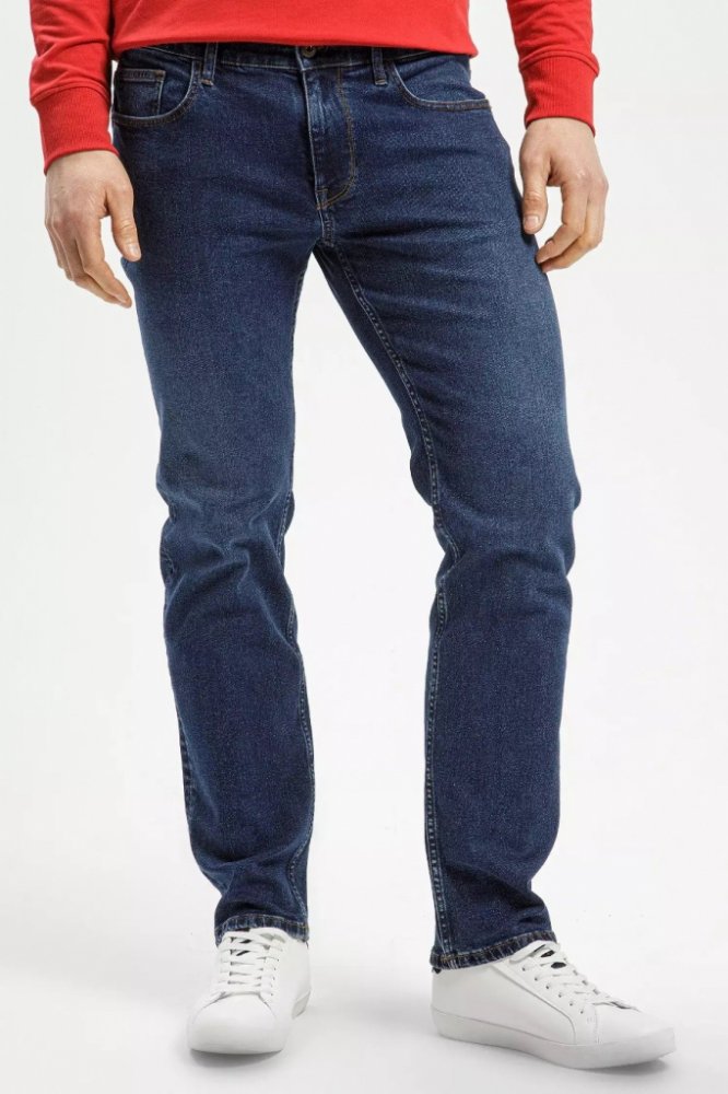 Klasické pěti kapsové džíny střihu JACK se středně vysokým sedem a mírně se zužujícími nohavicemi. Kalhoty jsou vyrobeny z příjemného tmavě modrého denimu a jsou lehce ošoupané. Díky příměsi elastanu jsou pohodlné při nošení.
