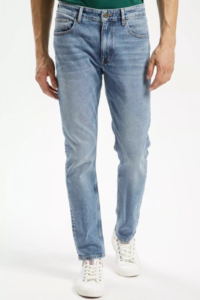 Moderní pěti kapsové džíny úzkého střihu TRAMMER se středně vysokým, vzadu vyšším sedem a zužujícími se nohavicemi. Kalhoty jsou vyrobeny z příjemného středně modrého denimu, jsou lehce ošoupané a mají efekt Buffies - vodorovné světlejší proužky na předním dílu. Díky příměsi elastanu jsou pohodlné při nošení.