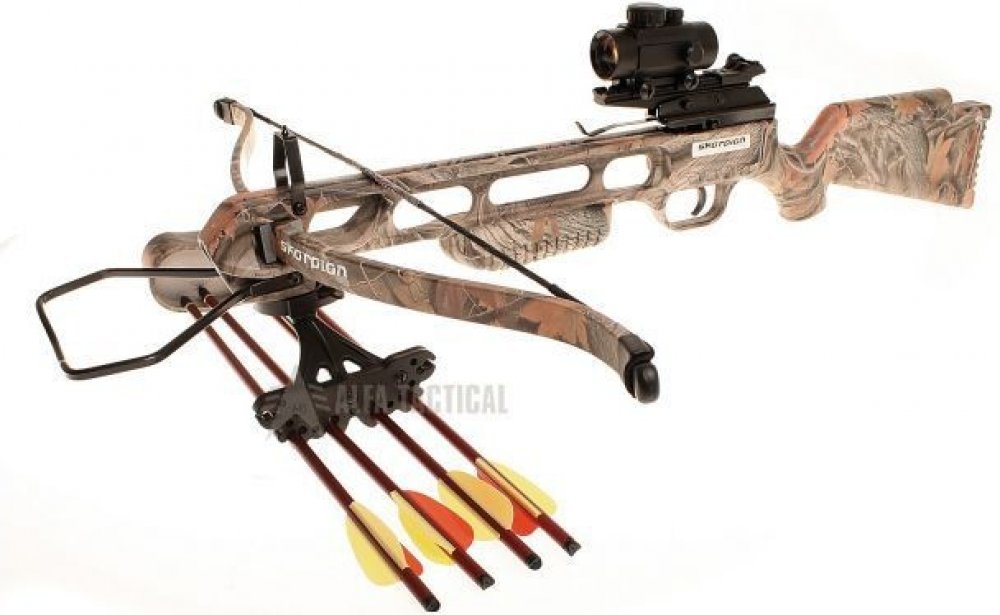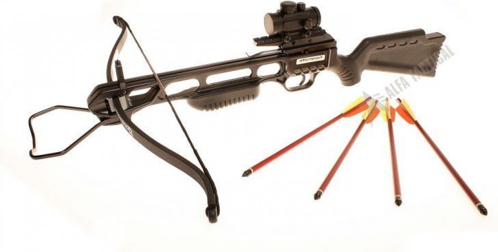 Reflexní kuše Skorpion XBR100 set, 175 liber, černá Kuše Skorpion XBR100 je přesná, spolehlivá kuše s nátahovou silou 175 liber v černé barvě se sklolaminátovým lučištěm, které dodá šípu rychlost až 220 FPS (65 m/s). Kuše je vhodná ke sportovní střelbě i loveckým účelům, je vybavena montážní lištou pro uchycení optických zaměřovačů a dalšího příslušenství i mechanickými mířidly. Tělo kuše je vyrobeno a obrobeno z přesného odlitku duralu. Osvědčená konstrukce, kovové tělo, přesně uložená ramena, polymerová pažba s lícnicí a přední úchop, hmotnost 2,8kg, vynikající poměr cena/výkon. Skorpion XBR100 Síla: 175 liber Počáteční rychlost šípu: 220 FPS (65 m/s) Typ kuše: Reflexní Rozpětí lučiště: 685 mm Celková délka: 88 cm Míření: Pevná mířidla se stavitelným hledím, kolimátor Doporučené šípy: 16 palcové, 27 gramů Set obsahuje: