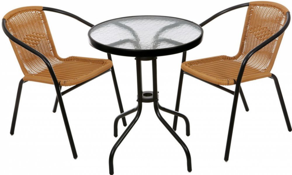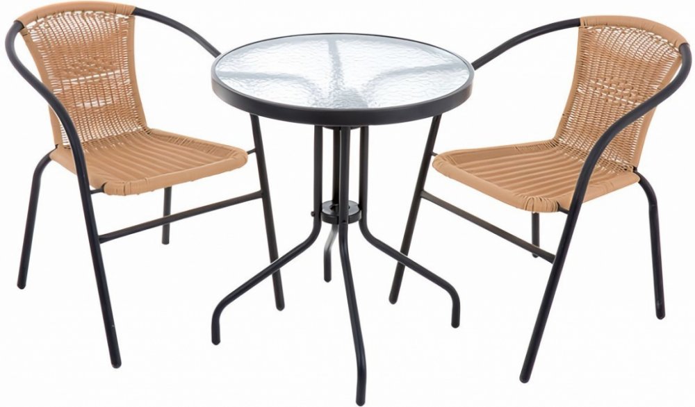 3dílný set kvalitního nábytku z kovové konstrukce a PE ratanu. 2 ks židlí a stůl se skleněnou výplní o průměru 60cm. Židle mají vyztužení pro lepší stabilitu a pevnost.