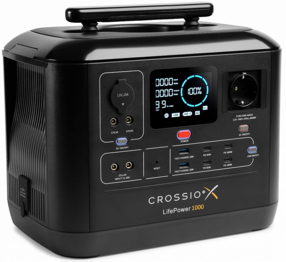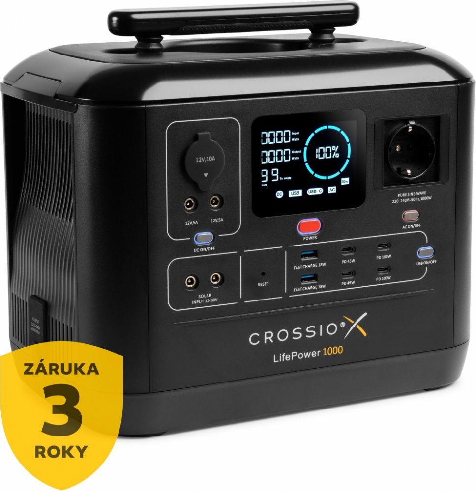 Nová přenosná stanice Crossio LifePower 1000 s kapacitou 1075.2Wh je ideální na cesty, do kempu, na chatu, zahradu nebo pro práci do terénu. Nově s rychlejším nabíjením, vylepšenou životností, podporou UPS a Boost-Up módem, který Vám dovolí napájet zařízení s příkonem až 1960 W. Našim stanicím se spolehlivými bateriemi LiFePO4 věříme, takže s koupí automaticky získáváte záruku na 3 roky ZDARMA.