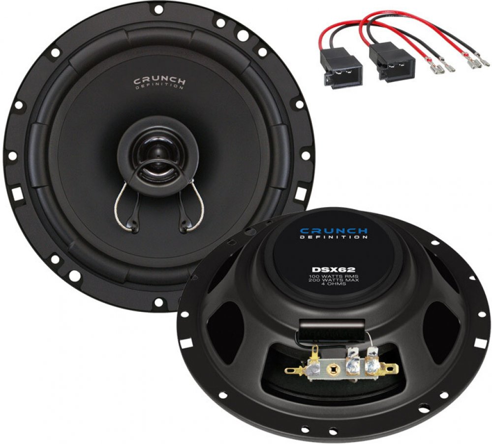 Obsahuje kvalitní 16.5 cm koaxiální 2-pásmové reproduktory DSX62 amerického výrobce CRUNCH a vše potřebné pro korektní výměnu. Tedy kabelové redukce z originálního kabelového svazku VW na klasické reproduktorové konektory..