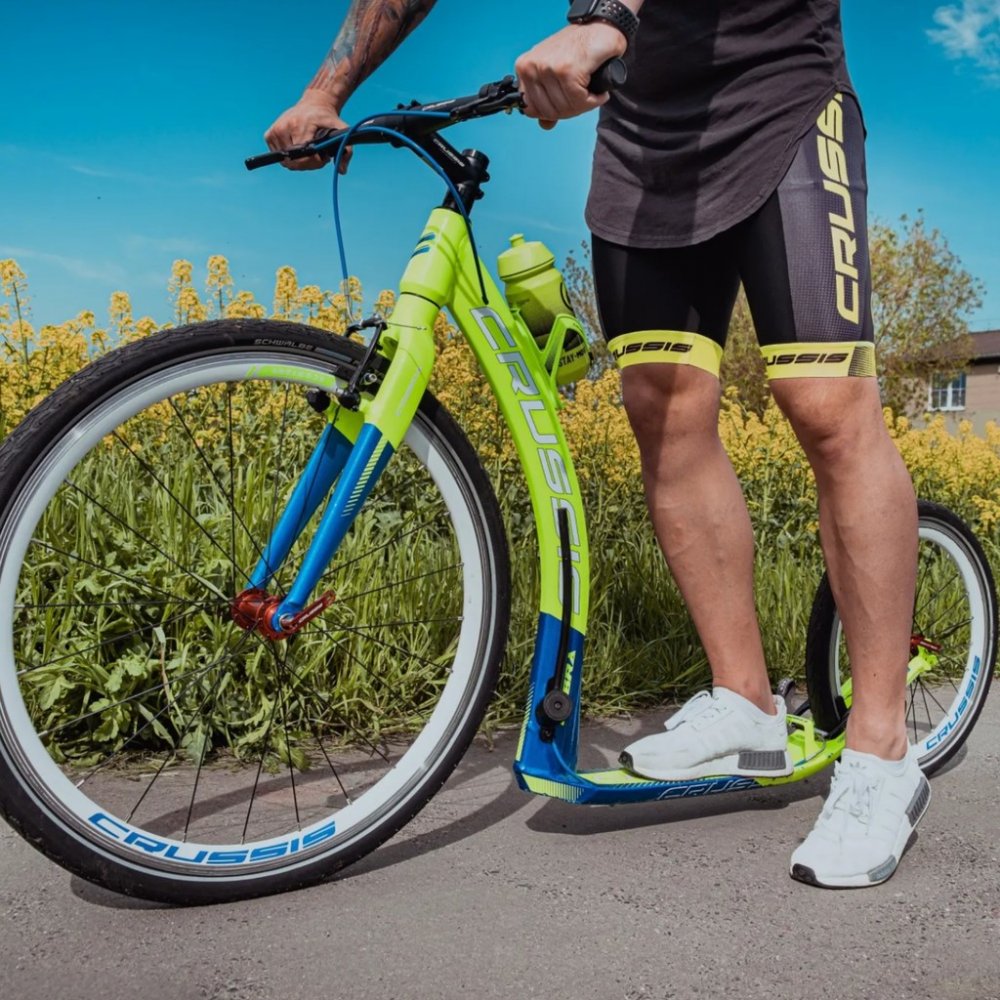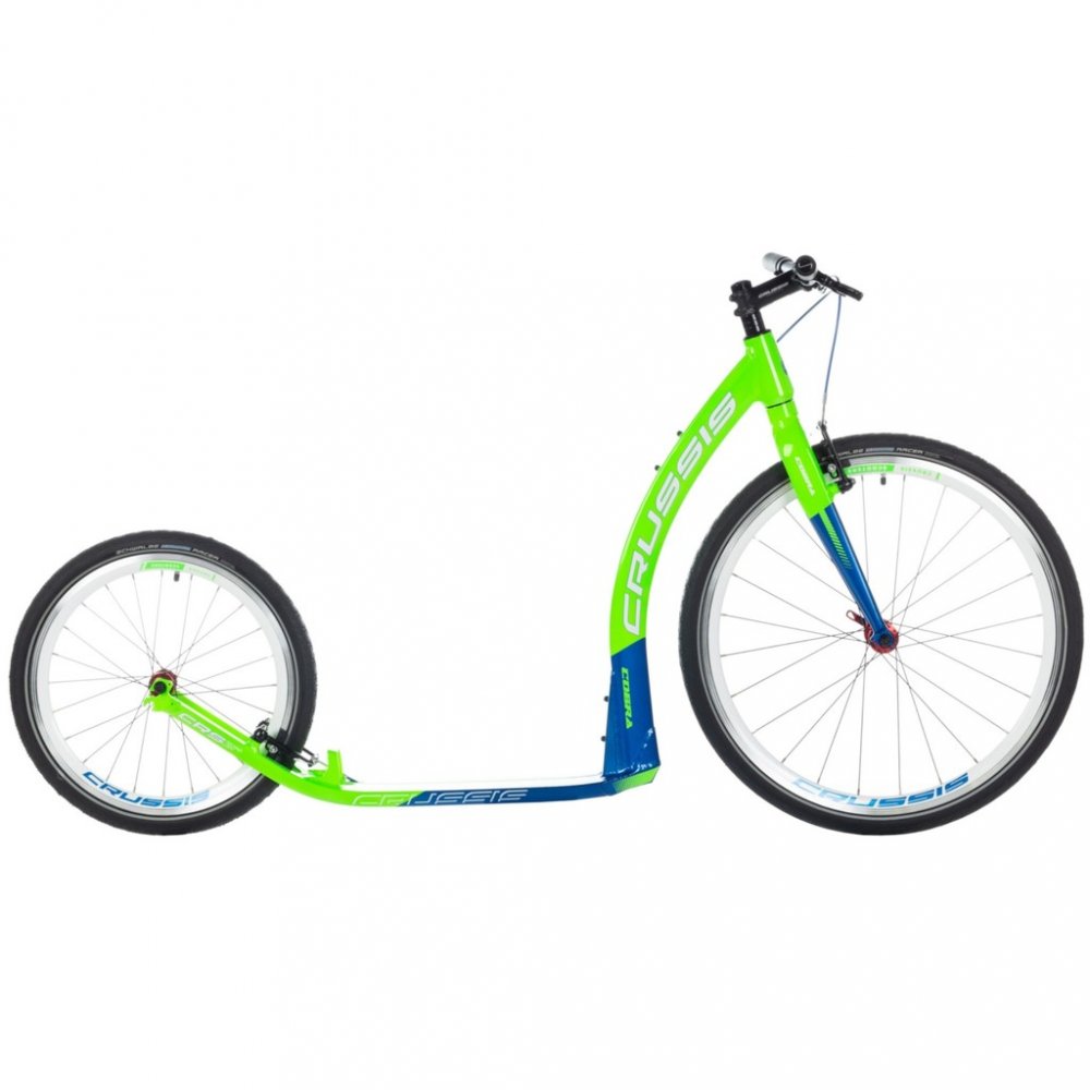 Unikátní hliníkový rám koloběžek Crussis Cobra byl vyvinut tak, aby se zadní vidlicí tvořil jeden celek. Nejedná se však o designový prvek, ale o konstrukční řešení eliminující únavové lomy v místech, kde je vidlice ke stupátku obvykle přivařena. Kónický tvar hlavové trubky spolu s trojúhelníkovým profilem krku zvyšuje pevnost rámu.