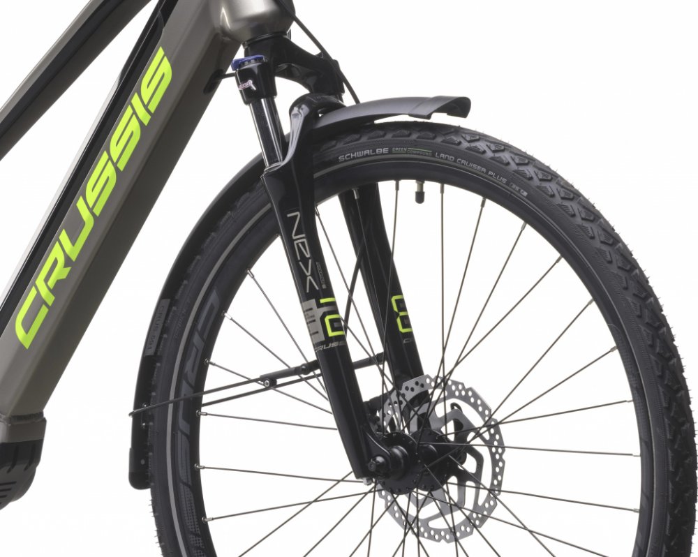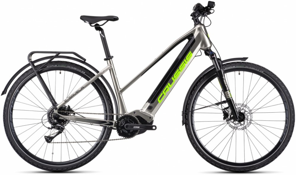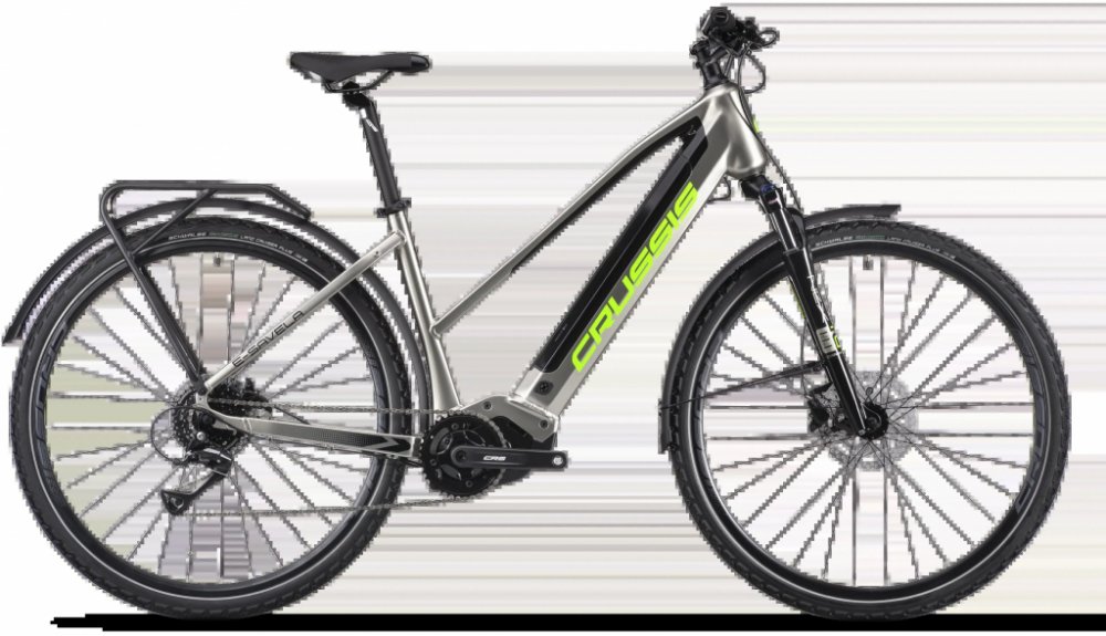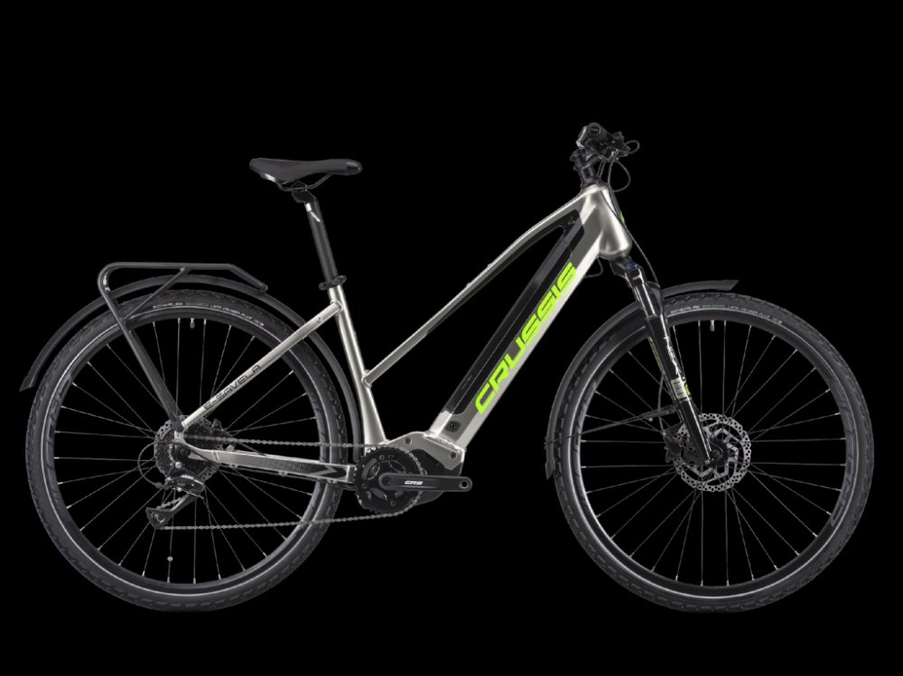 Crussis trekking/cross dámská 2025 170 km středové integrované na rámu Panasonic odpružená přední vidlice 63 mm kotoučové hliníkové Panasonic GX Power Plus 75 Nm