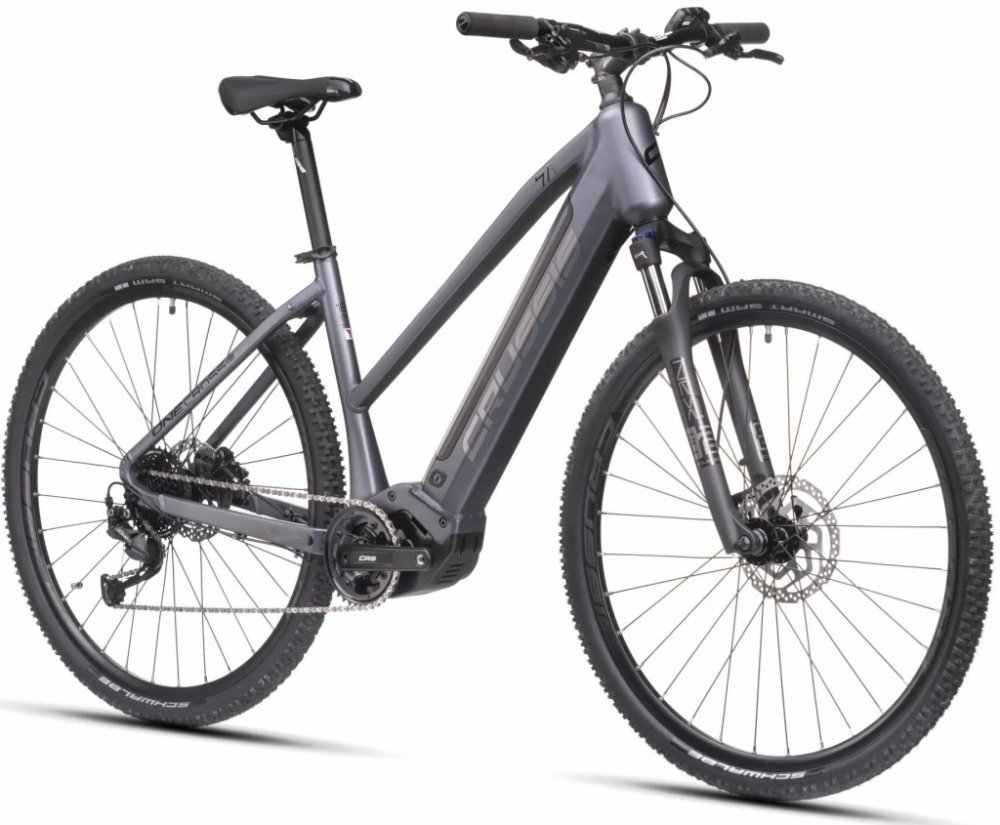 Crussis trekking/cross dámská 2025 170 km středové na rámu Panasonic odpružená přední vidlice 63 mm SHIMANO BR-MT200 hliníkové Panasonic GX Power Plus 75 Nm