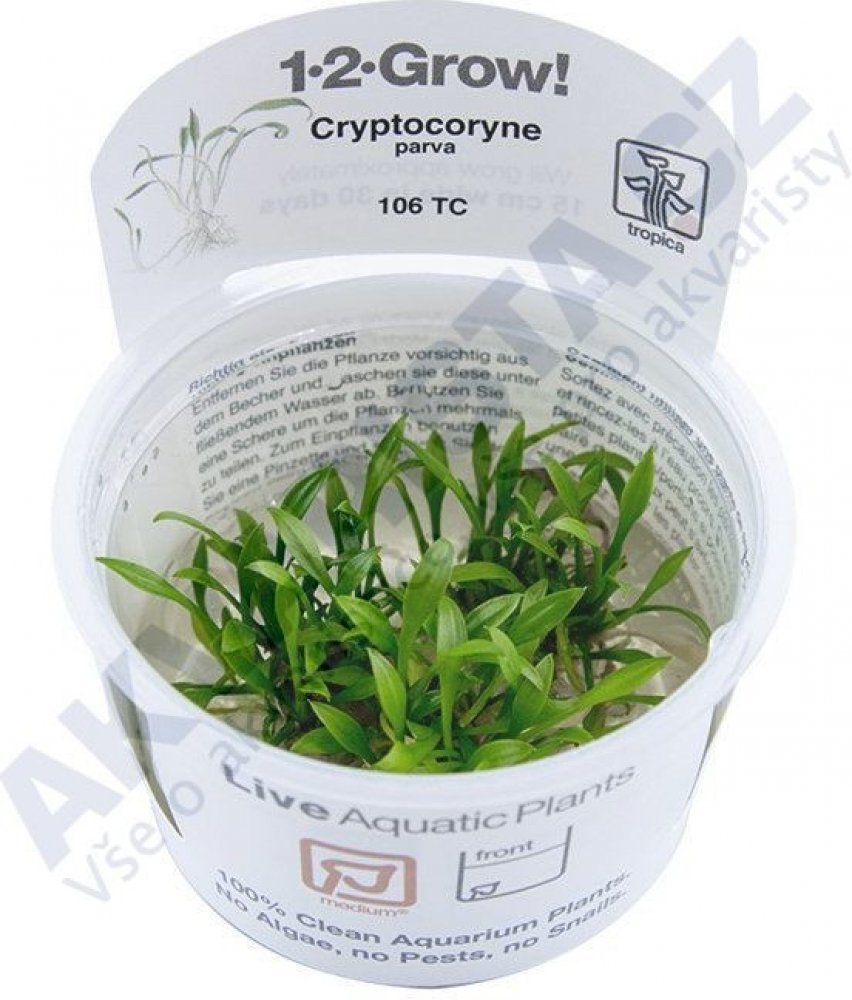 Cryptocoryne parva z Srí Lanka je nejmenší ze všech Cryptocoryne (pouze 3-6 cm vysoký a růžice méně než 5-8 cm široká). Je to jeden z mála druhů, který výrazně nemění tvar a barvu listů v závislosti na podmínkách pěstování. Potřebuje více světla než většina ostatních Cryptocoryne, protože pod vodou téměř ztrácí listovou desku. Nikdy jej tedy nesmí zastínit jiné rostliny.