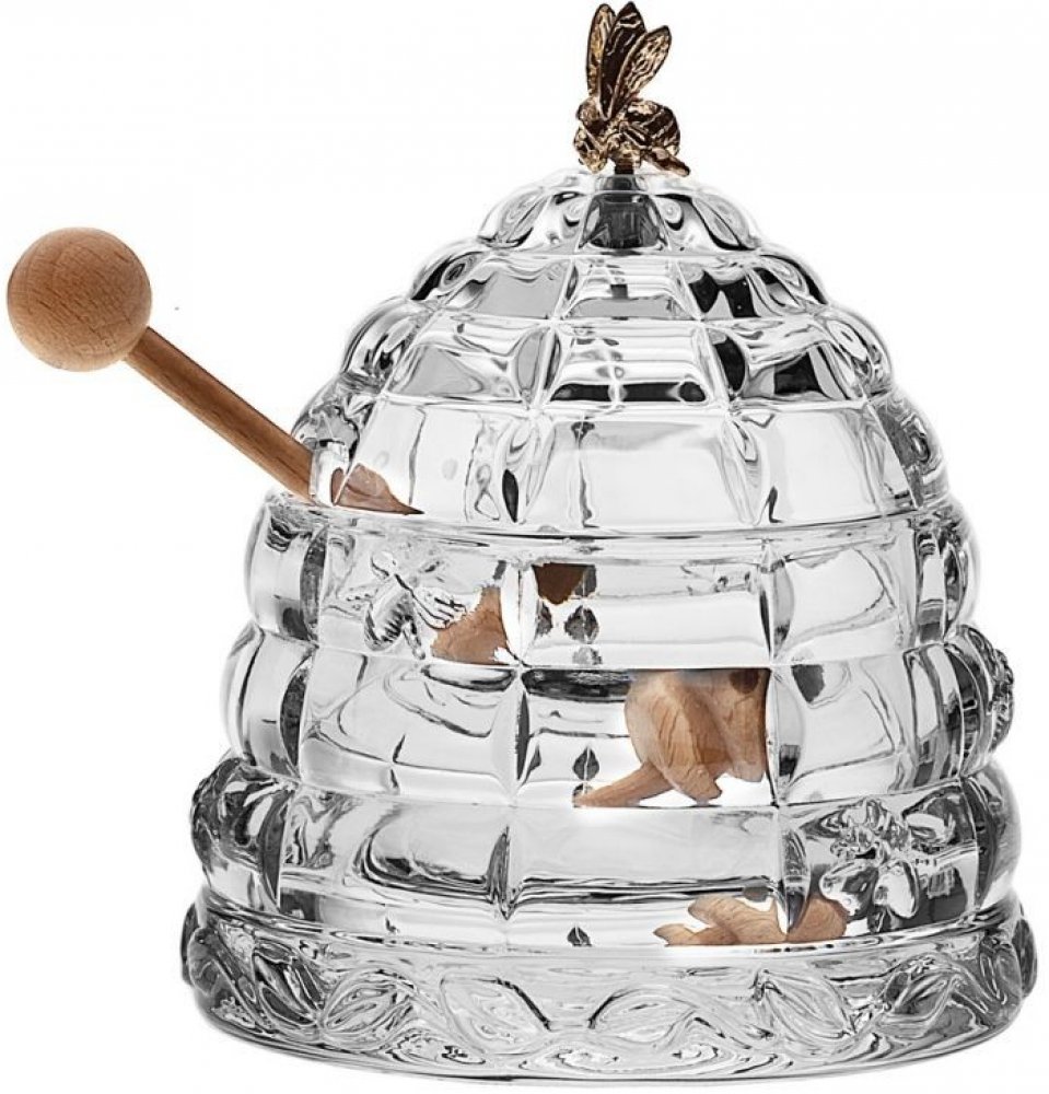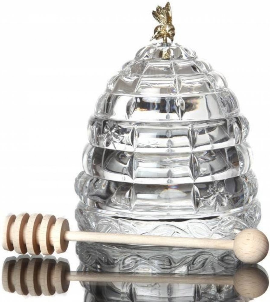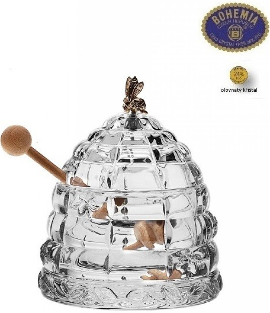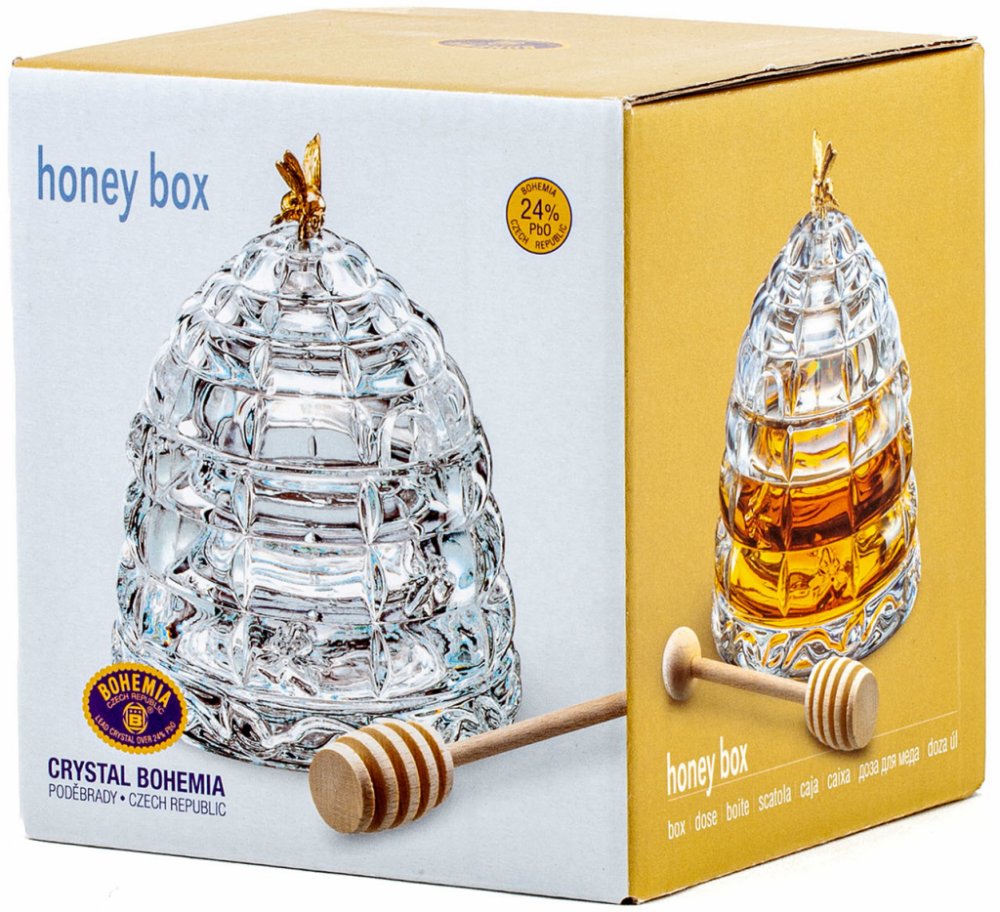 Skleněná dóza na med z olovnatého křišťálového skla ve tvaru včelího úlu. Držátko víčka znázorňuje včelu a je vyhotoveno z pozlacené oceli. Dóza je vybavena dřevěným naběrátkem medu. Výrobcem dózy je poděbradská sklárna Crystal Bohemia s více jak stoletou tradicí výroby olovnatého křišťálového skla. Olovnatý křišťál se vyznačuje vysokou mírou pevnosti, transarentnosti a brilance skl...