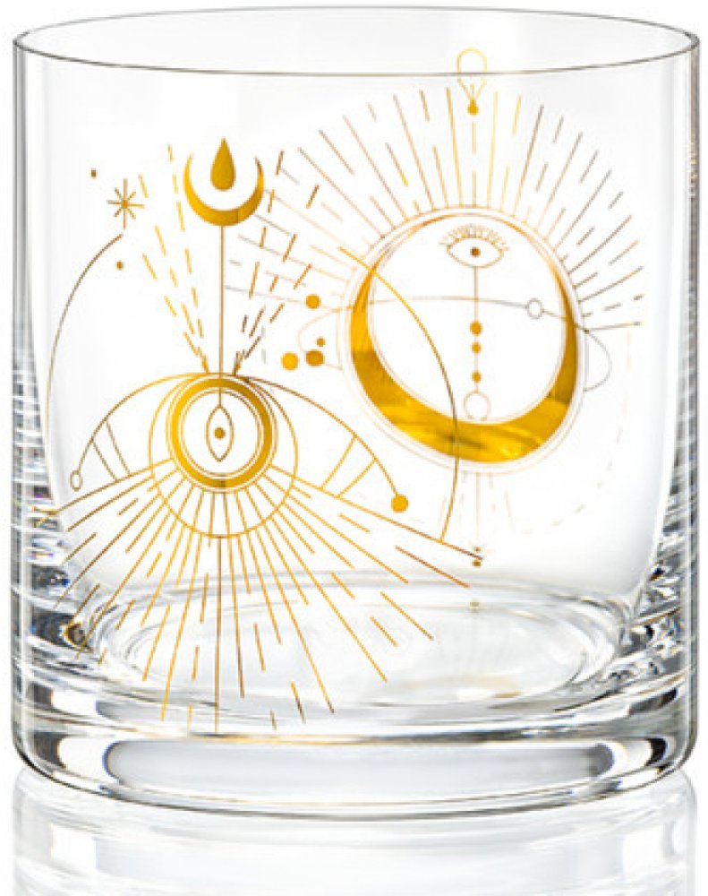 Sklenice na whisky 410 ml s dvěma zlatými motivy volně parafrázují alchymickou a astrologickou symboliku. Jen se podívejte skrze sklenku a nechte oba magické znaky překrýt – jakou budoucnost v nich vidíte? Kvalitní a praktický dárek české výroby. Vyrobeno z čirého bezolovnatého křišťálu s jemně zabroušeným okrajem sklenice. Nevhodné do myčky.
