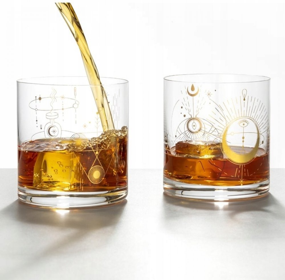 Sklenice na Whisky 410 ml s dvěma zlatými motivy volně parafrázující alchymickou a astrologickou symboliku. Vyrobeno z bezolovnatého křišťálu. Dárkové balení 2 ks.