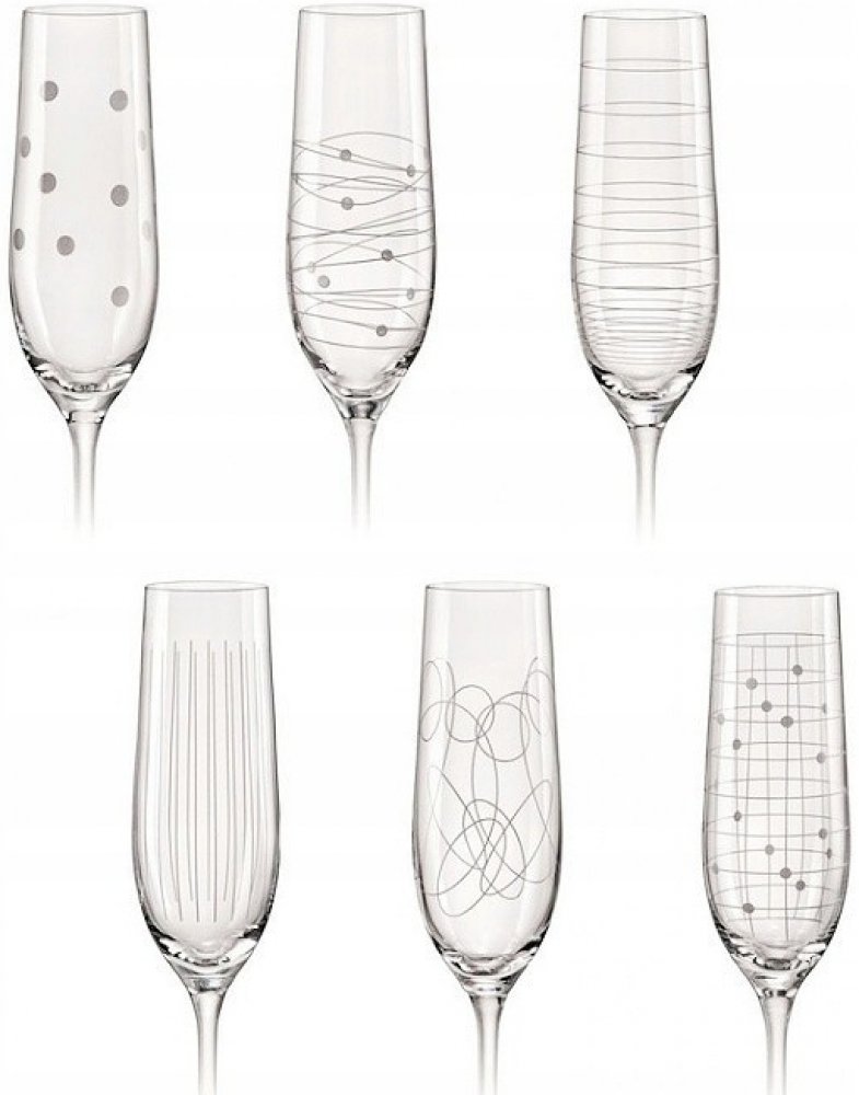 Sklenice Viola 190 ml na šampaňské a jiná šumivá vína z kolekce Elements. Set obsahuje 6 sklenic, z nichž každá má jiný dekor. Dekory vznikají broušením diamantovým kotoučkem. Každý si pozná svou sklenici, což je výhodou při větších oslavách nebo rodinných posezeních. Kvalitní a praktický dárek české výroby. Vyrobeno z čirého bezolovnatého křišťálu s jemně zabroušeným okrajem sklenice. Vhodné do myčky.