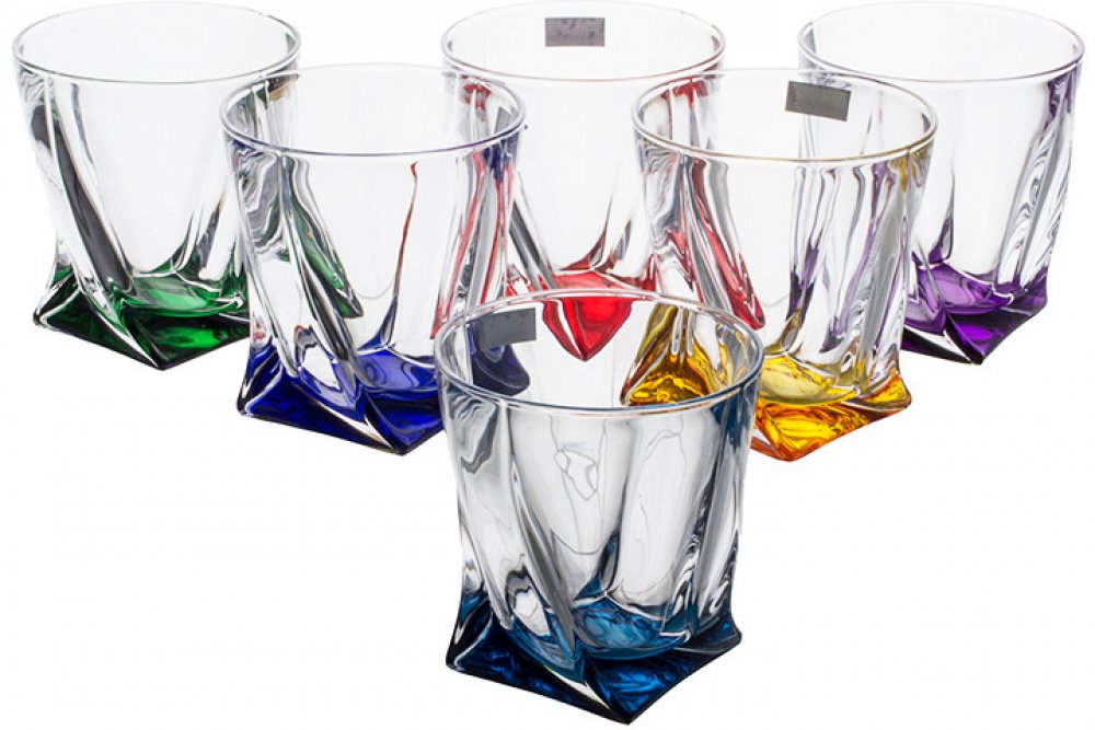 Barevné sklenice na whisky nebo vodu z bezolovnatého křišťálového skla. Kromě decentního zabarvení u dna vás sklenice zaujmou svým tvarováním. Točené tělo sklenice vychází ze čtvercového dna a postupně přechází do kruhového ústního okraje. Přestože mají sklenice zabarvené jen dno, tak odlesky při natáčení vyvolávají dojem plno barevnosti sklenice. Sklenice jsou vyrobeny z ekologicky šetrné sklovin...
