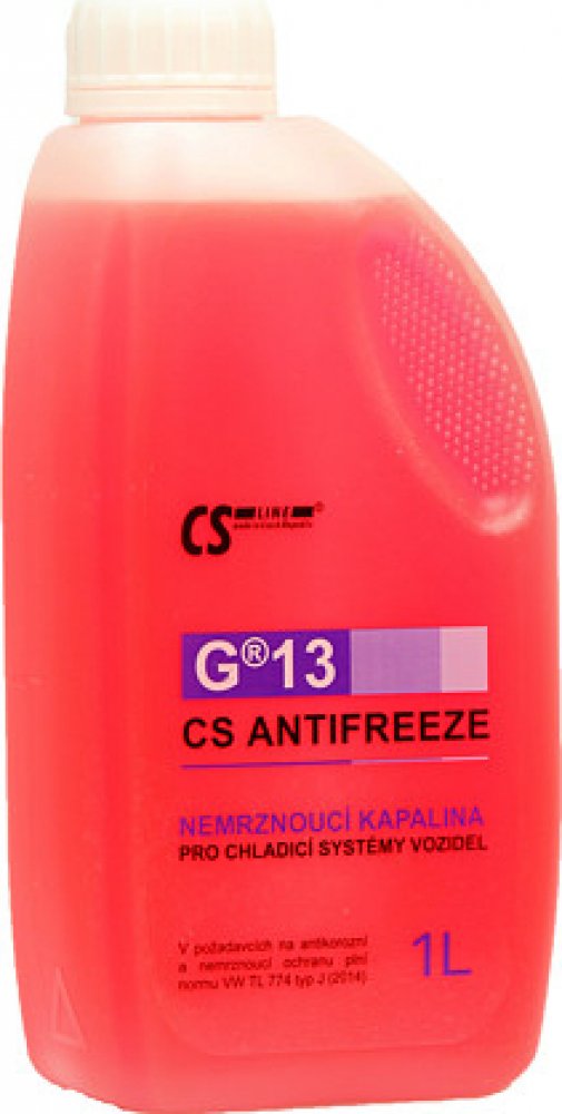 CS ANTIFREEZE G®13 je nejmodernější chladicí kapalina na bázi monoethylenglykolu s povinným obsahem biosložky, vhodná pro chladicí okruhy spalovacích motorů, ve kterých je jako konstrukční prvek použit převážně hliník. Produkt obsahuje nejvíce účinný systém inhibitorů koroze tzv. Si-OAT. Díky použití tohoto vysoce výkonného antikorozního systému je výměnná lhůta prodloužena až na 5 let. Obsahuje speciální aditiva potlačující pěnivost a zlepšující tekutost. CS ANTIFREEZE G®13 neobsahuje dusitany, aminy, fosfáty ani borax. Oblast použití: CS ANTIFREEZE G®13 se používá do chladicích okruhů nejnovějších osobních vozidel. Před použitím se ředí vodou* na požadovanou koncentraci od 30 do 55 obj. %, Vlastnosti: • Zajišťuje kvalitní antikorozní ochranu. • Chrání proti kavitaci. • Zabraňuje vzniku úsad. • Nepoškozuje laky ani pryže. • Splňuje mezinárodní standardy • Je plně mísitelný s ostatními kapalinami stejného typu. • Odpovídá kapalině používané pro první plnění v celém koncernu Volkswagen Group od roku 2011. • Určený do všech nových vozidel značek: AUDI, BENTLEY, BUGATTI, LAMBORGHINI, PORSCHE, SEAT, ŠKODA, VOLKSWAGEN. • Prodloužená výměnná lhůta na 5 let.