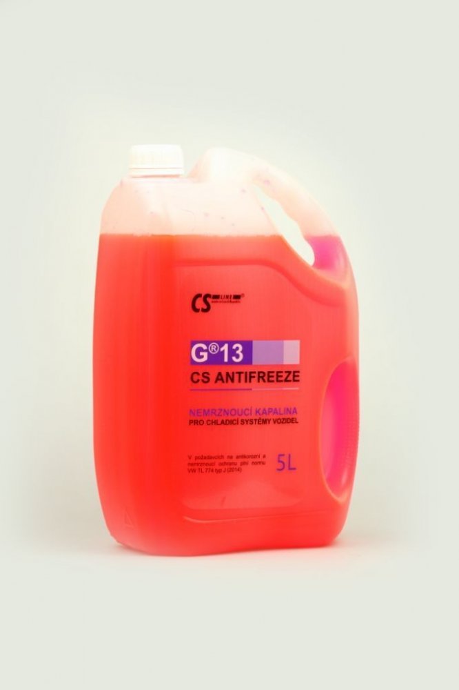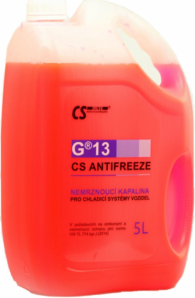 CS ANTIFREEZE G®13 je nejmodernější chladicí kapalina na bázi monoethylenglykolu s povinným obsahem biosložky, vhodná pro chladicí okruhy spalovacích motorů, ve kterých je jako konstrukční prvek použit převážně hliník. Produkt obsahuje nejvíce účinný systém inhibitorů koroze tzv. Si-OAT. Díky použití tohoto vysoce výkonného antikorozního systému je výměnná lhůta prodloužena až na 5 let. Obsahuje speciální aditiva potlačující pěnivost a zlepšující tekutost. CS ANTIFREEZE G®13 neobsahuje dusitany, aminy, fosfáty ani borax. Oblast použití: CS ANTIFREEZE G®13 se používá do chladicích okruhů nejnovějších osobních vozidel. Před použitím se ředí vodou* na požadovanou koncentraci od 30 do 55 obj. %, Vlastnosti: • Zajišťuje kvalitní antikorozní ochranu. • Chrání proti kavitaci. • Zabraňuje vzniku úsad. • Nepoškozuje laky ani pryže. • Splňuje mezinárodní standardy • Je plně mísitelný s ostatními kapalinami stejného typu. • Odpovídá kapalině používané pro první plnění v celém koncernu Volkswagen Group od roku 2011. • Určený do všech nových vozidel značek: AUDI, BENTLEY, BUGATTI, LAMBORGHINI, PORSCHE, SEAT, ŠKODA, VOLKSWAGEN. • Prodloužená výměnná lhůta na 5 let.