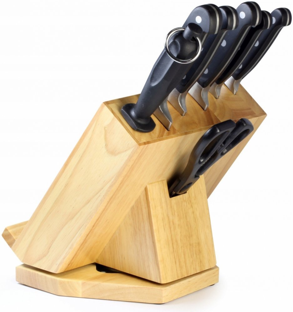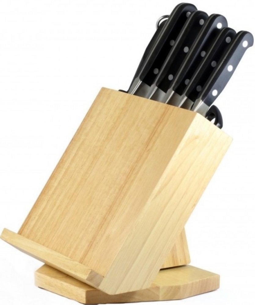 Sada 5 ks dokonale vyvážených nožů s nerezovou čepelí a klasickým vzhledem rukojeti se třemi nýty je doplněna o nůžky a ocílku. Vše uloženo v dřevěném otočném stojanu s držákem na tablet či kuchařku.