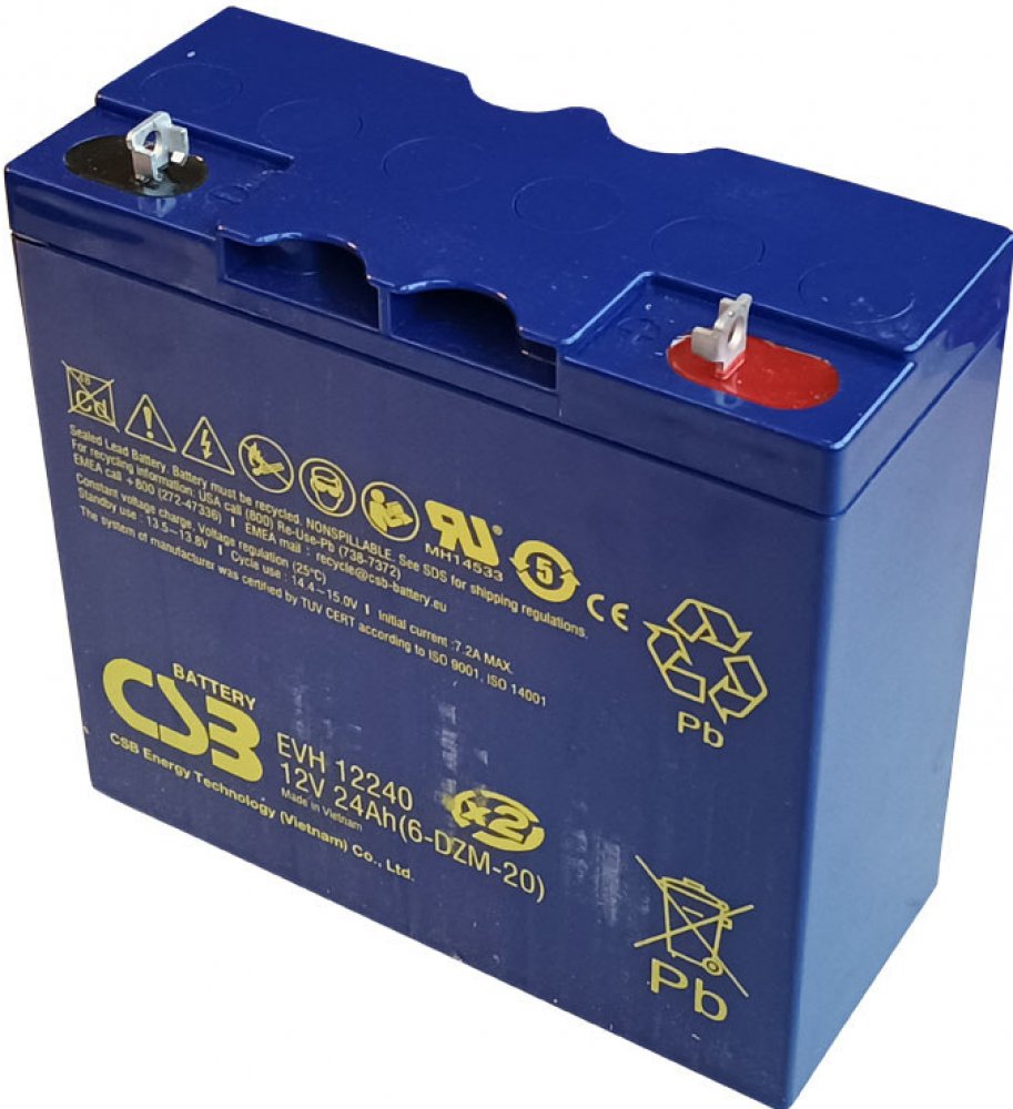 Olověný akumulátor 12V 24Ah CSB EVH12240B3Akumulátor EVH12240 je záložní, bezúdržbový, uzavřený akumulátor od CSB Battery, navržený pro cyklický provoz. Díky technologii AGM je akumulátor lehký a vhodný pro různé nabíječe. Tento model je ideální pro elektrická vozidla, kola, golfové a nákupní vozíky.Akumulátor EVH12240 zvládne až 350 cyklů při 100% vybití nebo poskytuje až 5 let provozu v režimu „Standby“. Je bezúdržbový a může pracovat v jakékoli poloze.Upozornění: Uzavřené bezúdržbové akumulátorové baterie VRLA mohou být snadno poškozeny nevhodnou nabíječkou.Technické parametry: Napětí: 12V Kapacita 20 hod.: 24Ah Max. vyb. proud 5 sec.: 320A Optimální životnost: 5 let Délka (mm): 181 Šířka (mm): 76 Výška (mm): 170 Výška s kontakty (mm): 178 Hmotnost (kg): 7.55 Typ pólu: Plochý vývod (oka) Použití: Cyklický provoz, UPS, Všeobecné, VysokozátěžovéKompatibilita: - Elektrická vozidla - Kola - Golfové vozíky - Nákupní vozíky