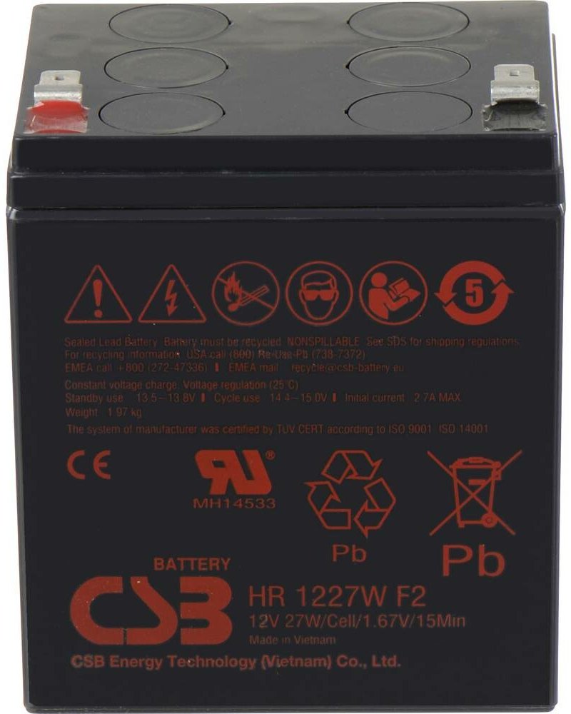 Akumulátor CSB HR1227WF2 (12V/6,2Ah)Záložní, bezúdržbový, VRLA, uzavřený, vysokovýkonný akumulátor od CSB Battery. Technologie AGM. Určený nejen pro záložní zdroje UPS, EZS, EPS atd. Řada akumulátorů HR je speciálně vytvořena pro aplikace s vyšším stupněm vybíjení. Tato řada je vytvořena jako malá a lehká baterie, se servisní životností 3 až 5 let v režimu „Standby" nebo pro více jak 260 cyklů vybití. Díky své inovované konstrukci, se zvýšil výkon řady HR o více jak 20% oproti ostatním porovnatelným produktům. Tak jako ostatní baterie od CSB, je i akumulátor HR1227WF2 bezúdržbový, vysoce účinný, uzavřený a pracující v jakékoli poloze. Technické parametryNapětí: 12 VKapacita 20hod.: 6,2AhMax. vyb. proud 5 sec.: 130 AOptimální životnost: 5 letDélka: 90 mmŠířka: 70 mmVýška: 101 mmVýška s kontakty: 106 mmHmotnost: 1,97 kgTyp pólu: Faston 6,3 mmPoužití: EZS, EPS, UPS, Všeobecné, VysokozátěžovéObrázek je pouze ilustračního charakteru. Rozměry jsou uvedeny ve specifikacích.