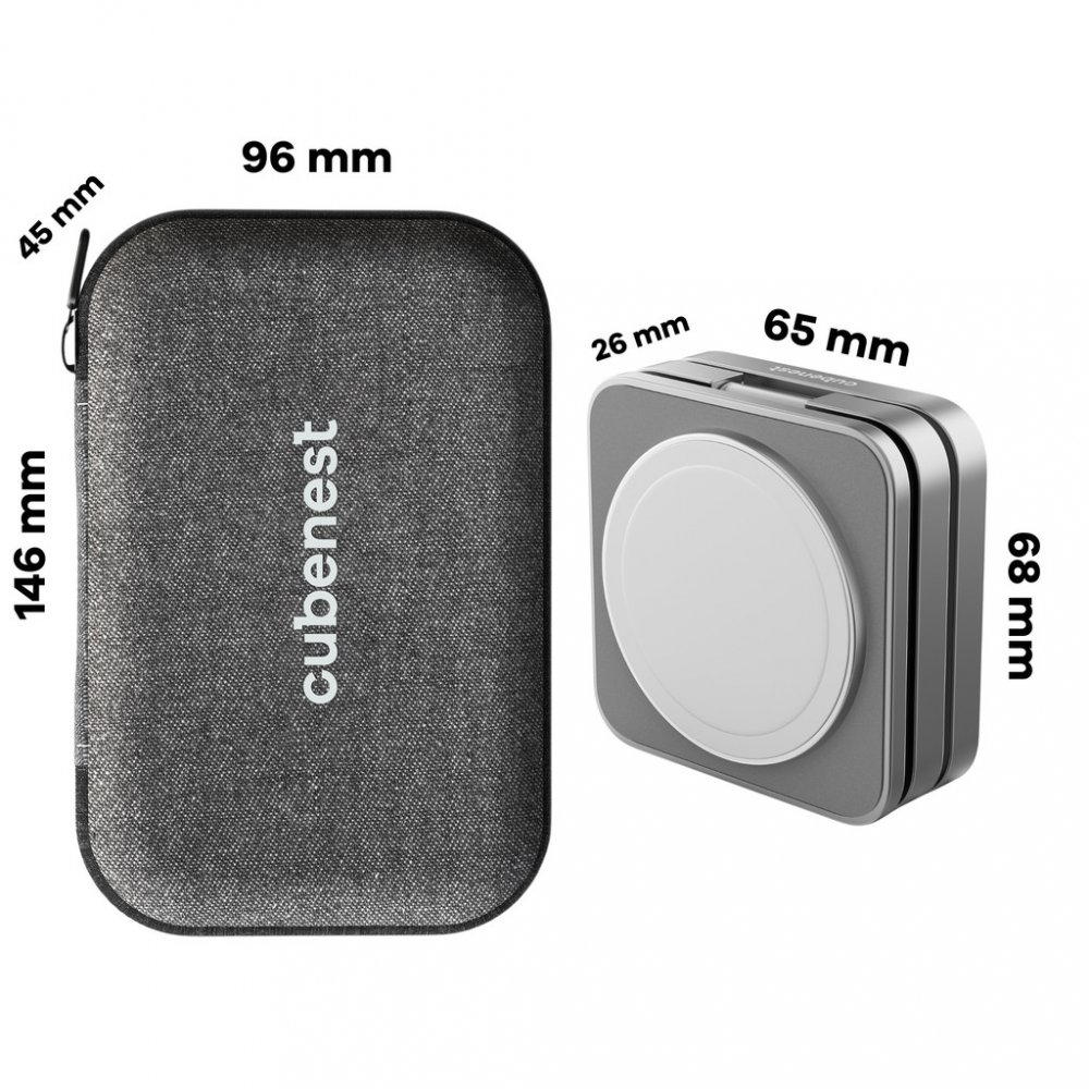 Skládací bezdrátová magnetická nabíječka. Skladná. Kompaktní rozměry. Elegantní design. Kvalitní zpracování. 360° rotace. Nízké těžiště. Protiskluzová podložka. Funkce automatického vypnutí. Kompatibilní se všemi zařízeními podporujícími technologii bezdrátového nabíjení. Tepelná ochrana, přepěťová ochrana, proudová ochrana. Hmotnost 205 g. Součástí je pouzdro.