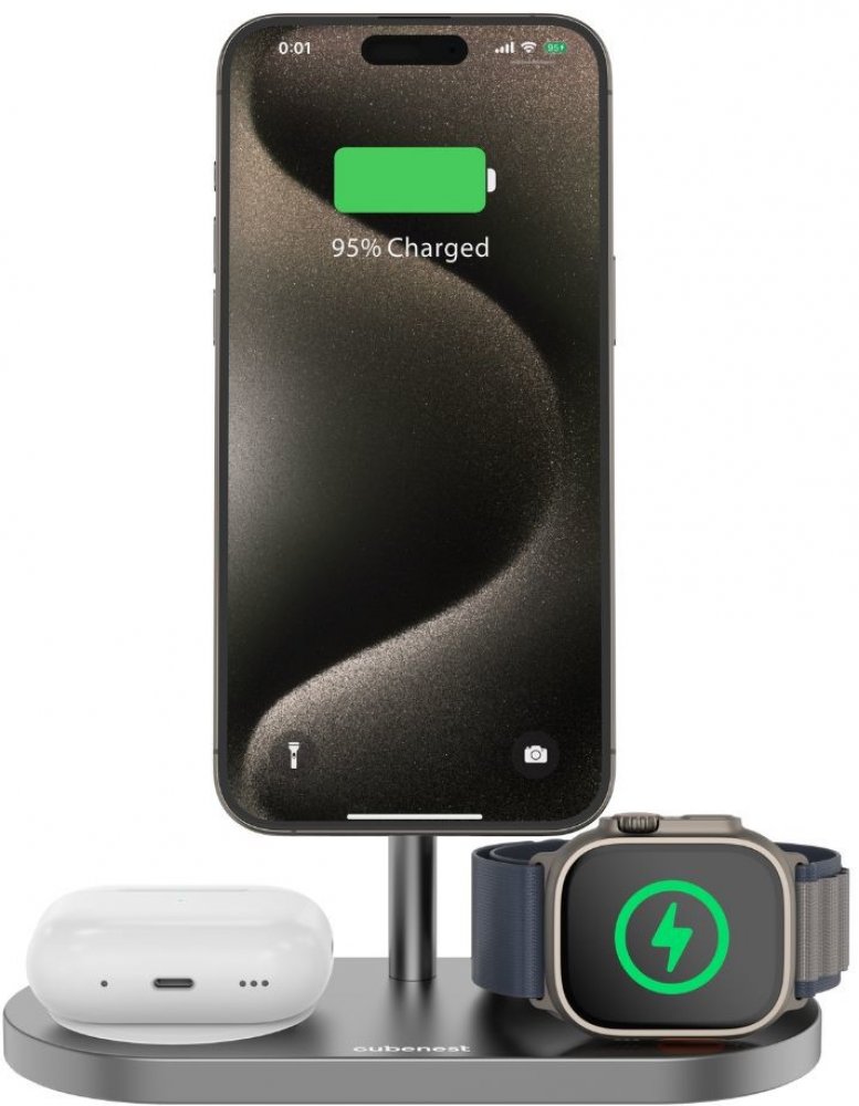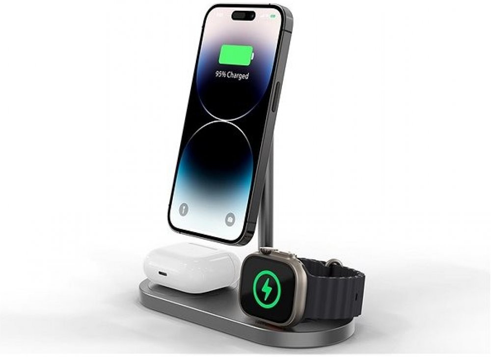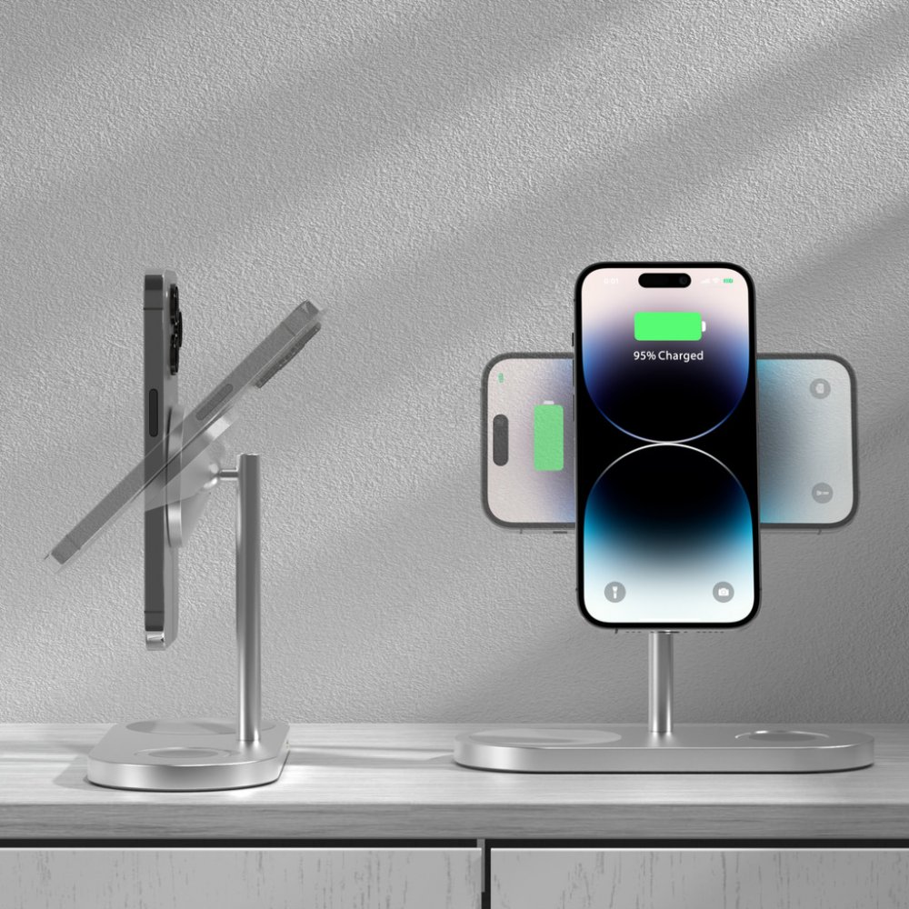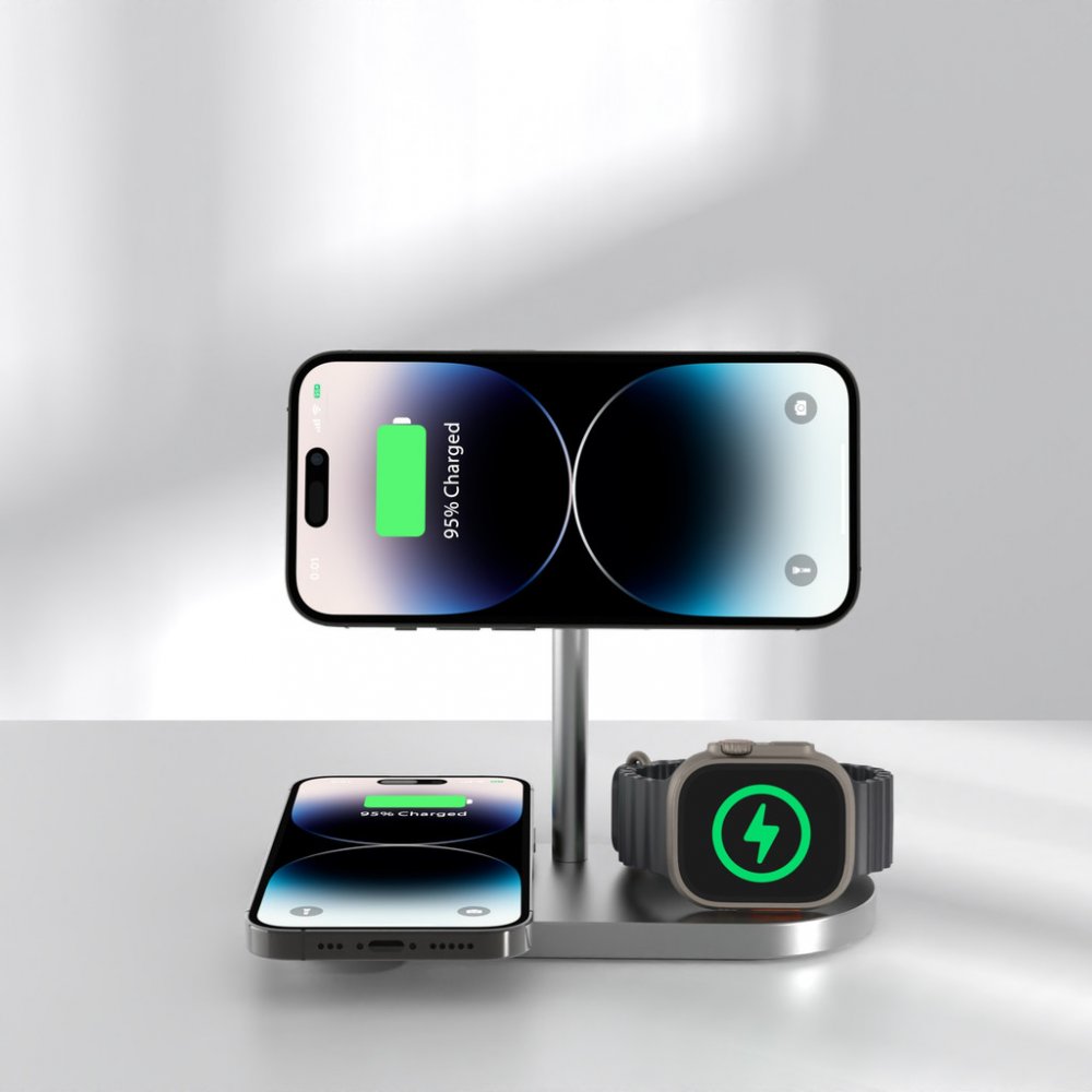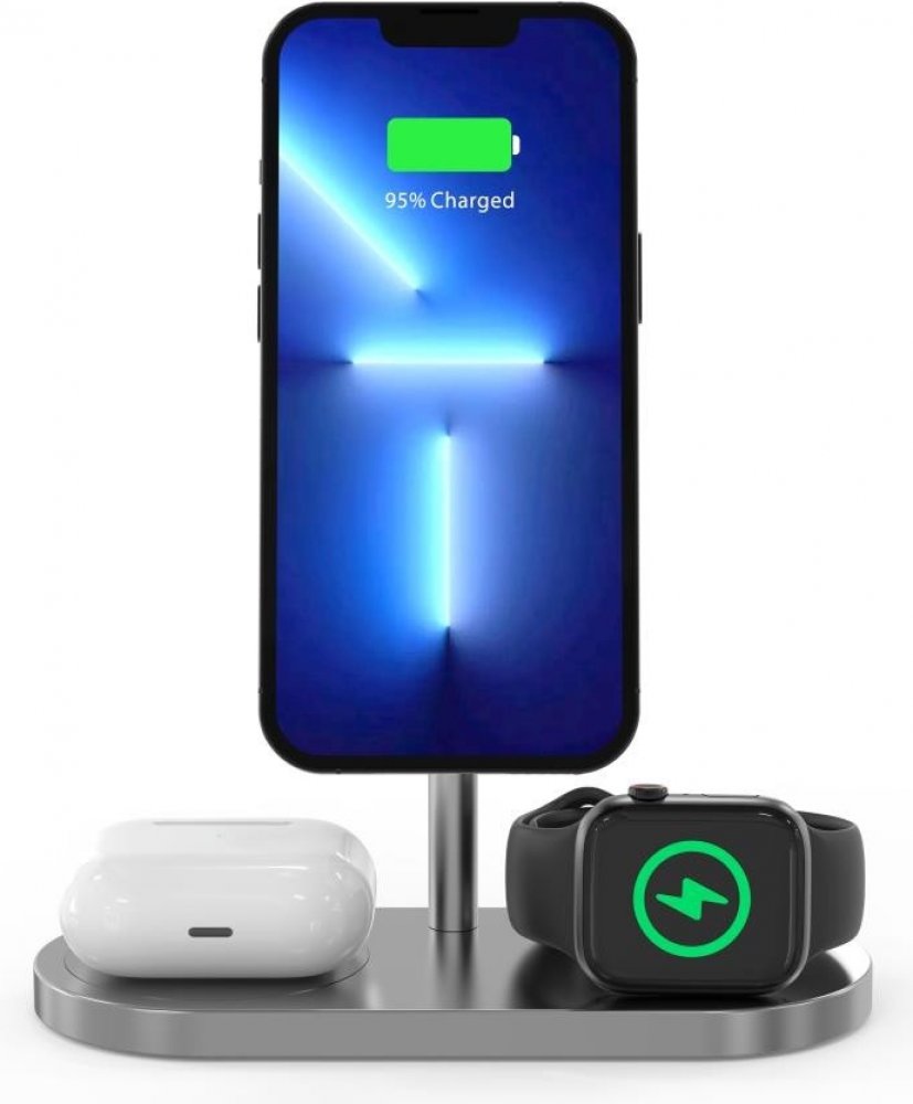 Bezdrátová magnetická nabíječka 3 v 1, kompatibilní s funkcí MagSafe, navržená k nabíjení dvou zařízení a Apple Watch současně. Nízké těžiště a protiskluzová podložka zajistí stabilitu při používání telefonu, zatímco silný magnet udrží telefon pevně na místě v průběhu i po nabití. Nabíječka navíc automaticky vypne nabíjení po plném nabití vašeho zařízení.