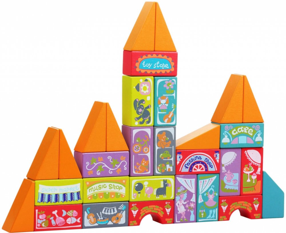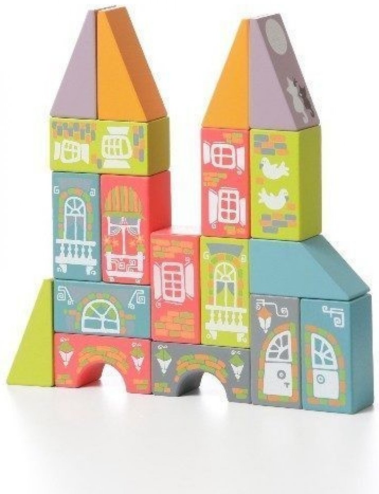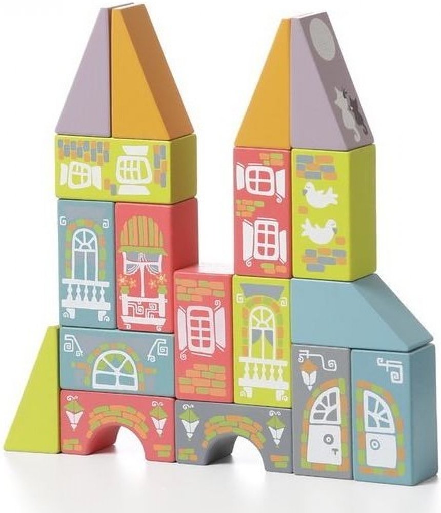 Krásná dřevěná stavebnice, obsahuje 18 dřevěných kostek v různých barvách s namalovanými obrázky ke stavění domečků.