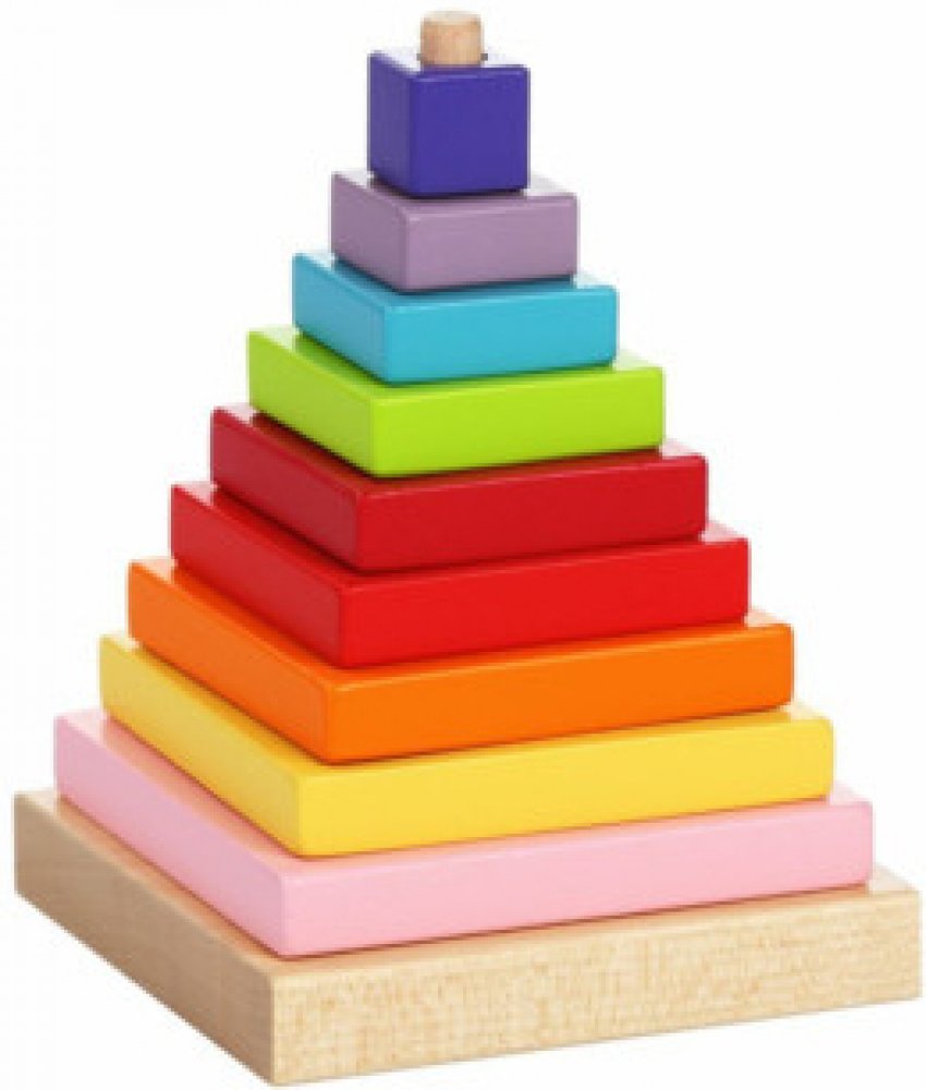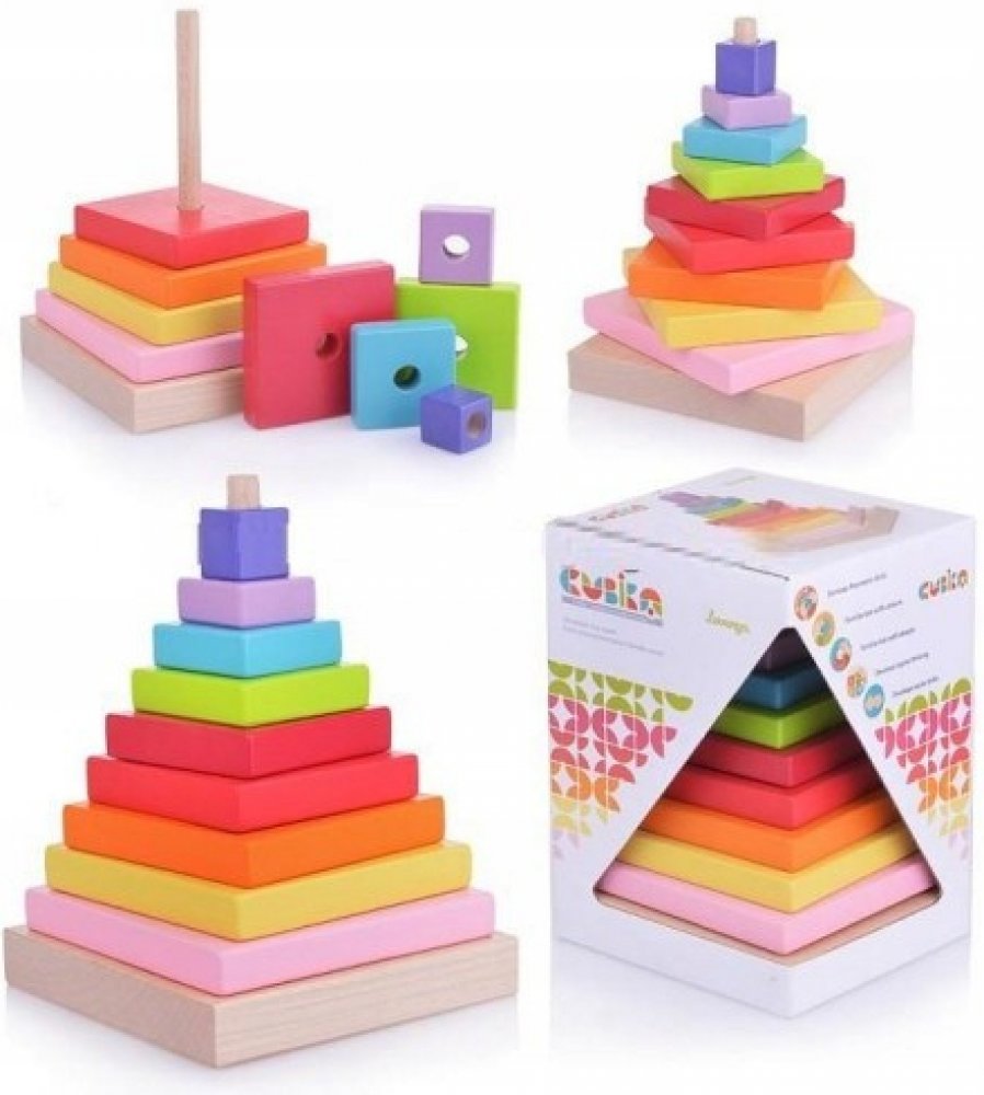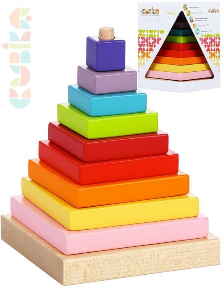 Barevná věžička pyramida je dřevěná skládačka s 9 díly, které by na sebe měly být poskládány tak, aby bylo možné zachovat při stavbě správný tvar starodávné egyptské pyramidy. Hračka pro nejmenší děti, pro miminko.