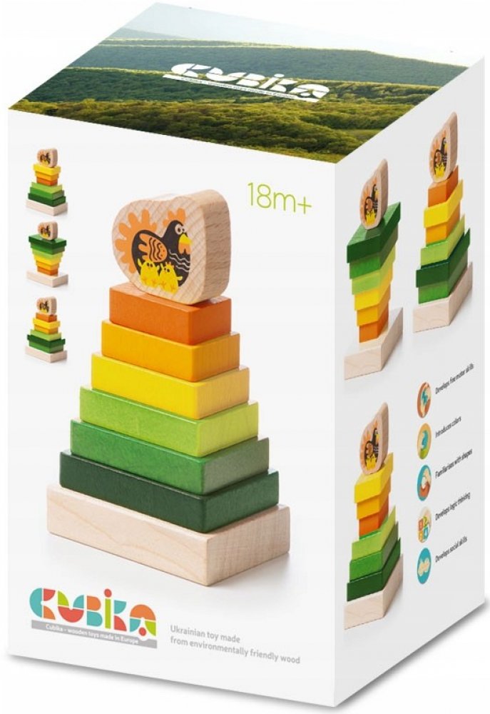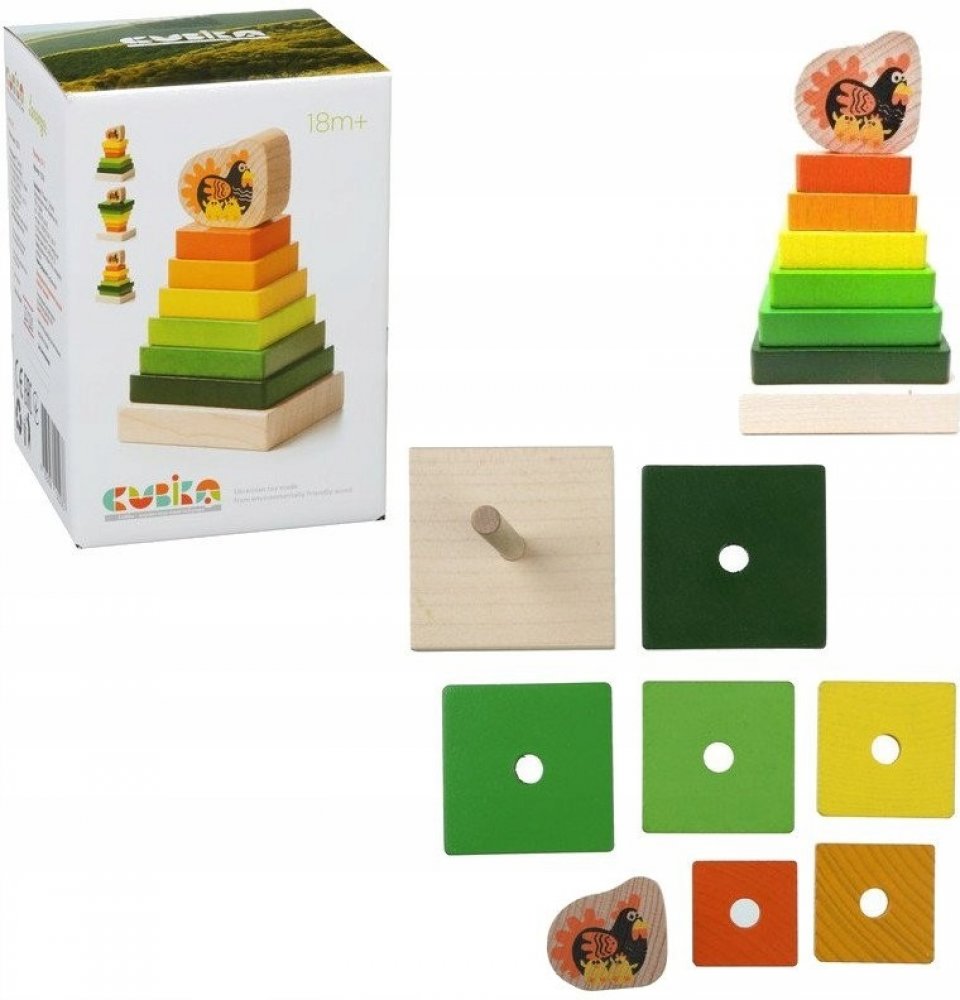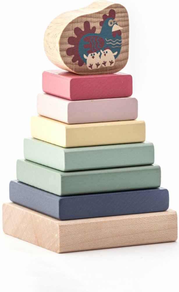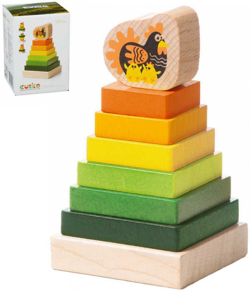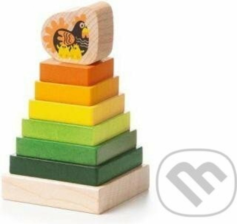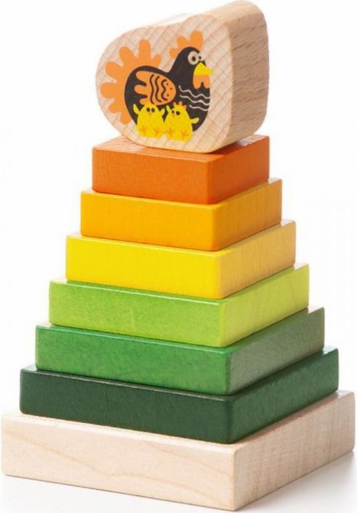 Děti si natrénují nasazování různě velkých kvádrů na podstavec. Na vršku je kostka se slepičkou a jejími kuřátky. Veselé barvy, kvalitní provedení.