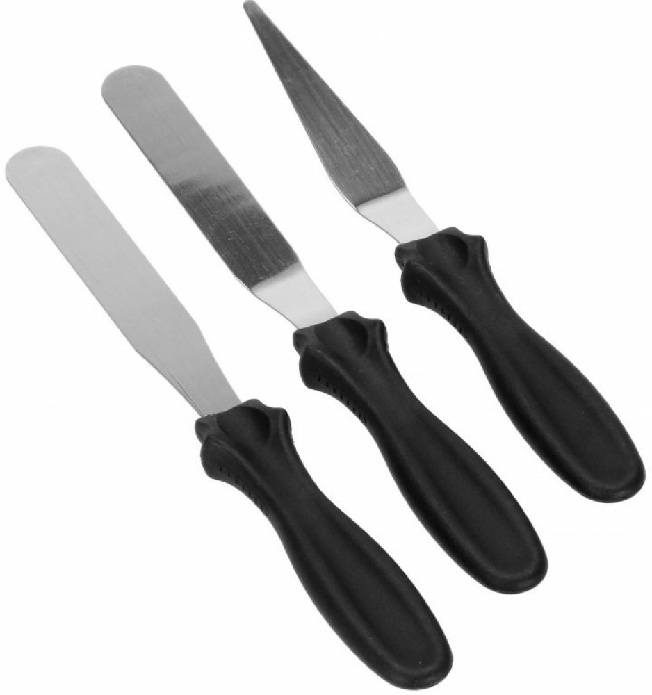 Sada 3ks zdobících cukrářských stěrek z nerezové oceli. Kvalitní a odolný materiál. Nízká hmotnost, pohodlná manipulace. Univerzální využití, profilované rukojeti, snadné čištění. Certifikovaný výrobek, vhodný pro každého cukráře.
