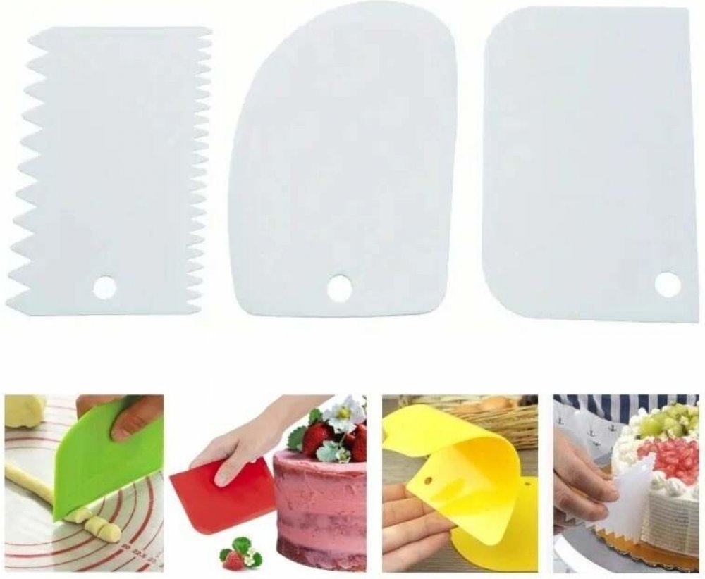 Sada tří plastových stěrek různých tvarů je určena pro tvarování krému a vytváření cukrářských ozdob na dorty a jiné pečivo. Jsou ideální pro roztírání, tvarování, vyhlazování a vytváření vzorů v polevě, krému, husté smetaně a cukrové pastě. Lze je použít na čištění misek, hlazení polevy apod. Lze je použít i jako nástroj pro odstranění přebytečného těsta nebo mouky z pracovní plochy.