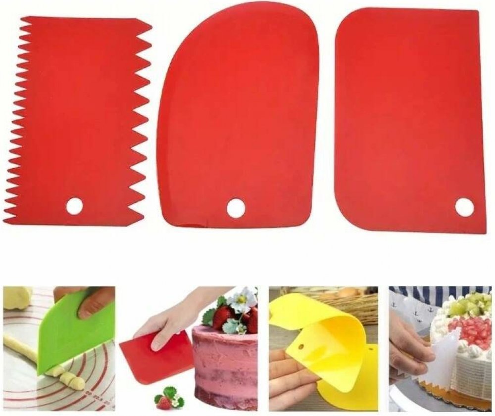 Sada tří plastových stěrek různých tvarů je určena pro tvarování krému a vytváření cukrářských ozdob na dorty a jiné pečivo. Jsou ideální pro roztírání, tvarování, vyhlazování a vytváření vzorů v polevě, krému, husté smetaně a cukrové pastě. Lze je použít na čištění misek, hlazení polevy apod. Lze je použít i jako nástroj pro odstranění přebytečného těsta nebo mouky z pracovní plochy.