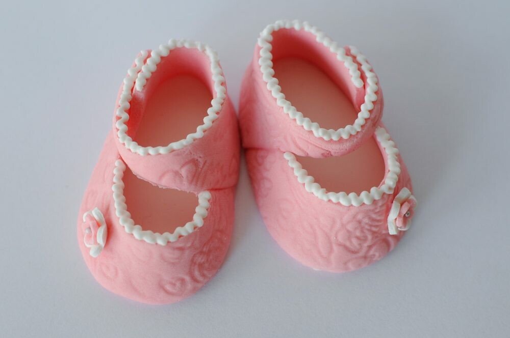 Samostatná cukrová dekorace na dort ve tvaru dětských papuček. Barevné varianty: růžová.