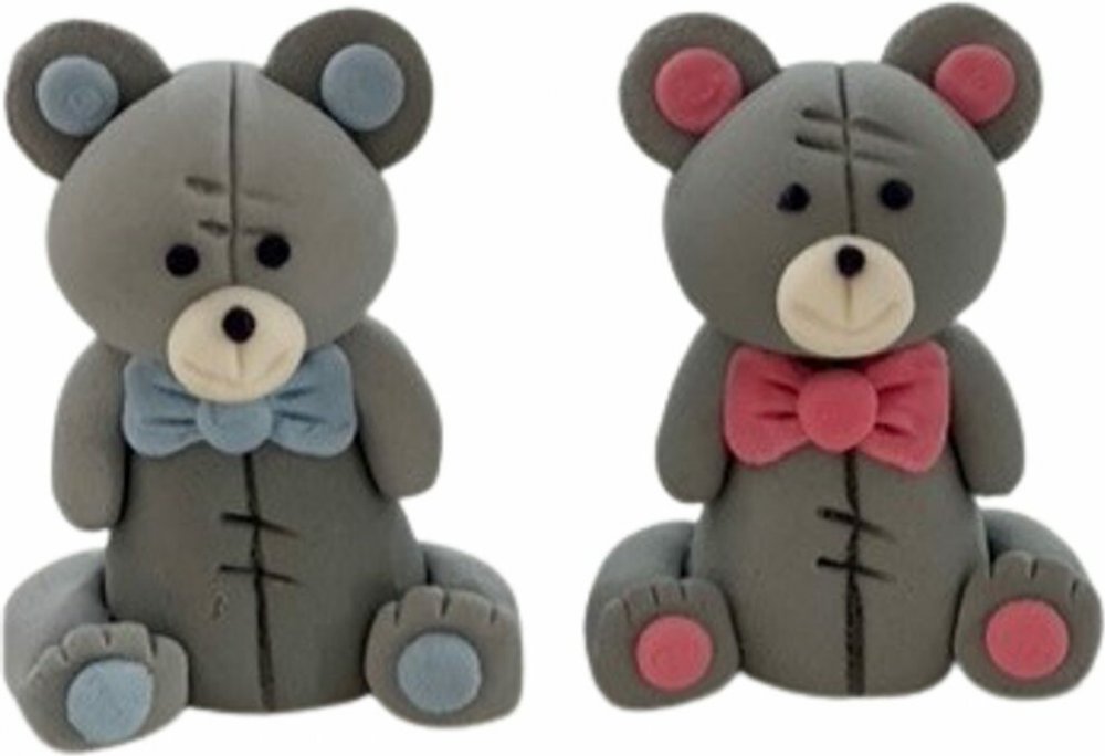 Cukrová dekorace s motivem medvídka určená na dort. Tato varianta má růžový motýlek.