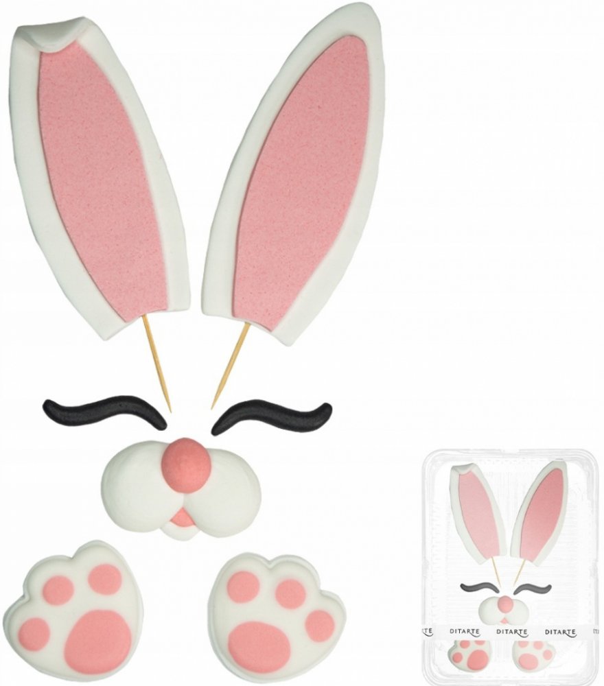 ⭐Naše speciální sada KRÁLÍČEK 2D obsahuje 7 cukrových prvků: tlapky, čumáček, pár očí a pár uší. Budou se krásně vyjímat na všech dortech, bez ohledu na jejich velikost, tvar nebo barvu.