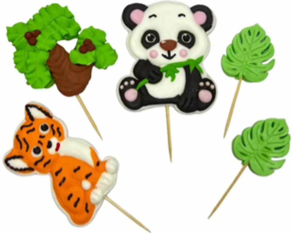 Cukrové ozdoby na dort ve tvaru pandy a tygra určené k zapíchnutí. Vhodné na dětské dorty. Sada obsahuje vše z fotografie.
