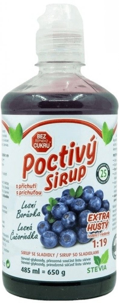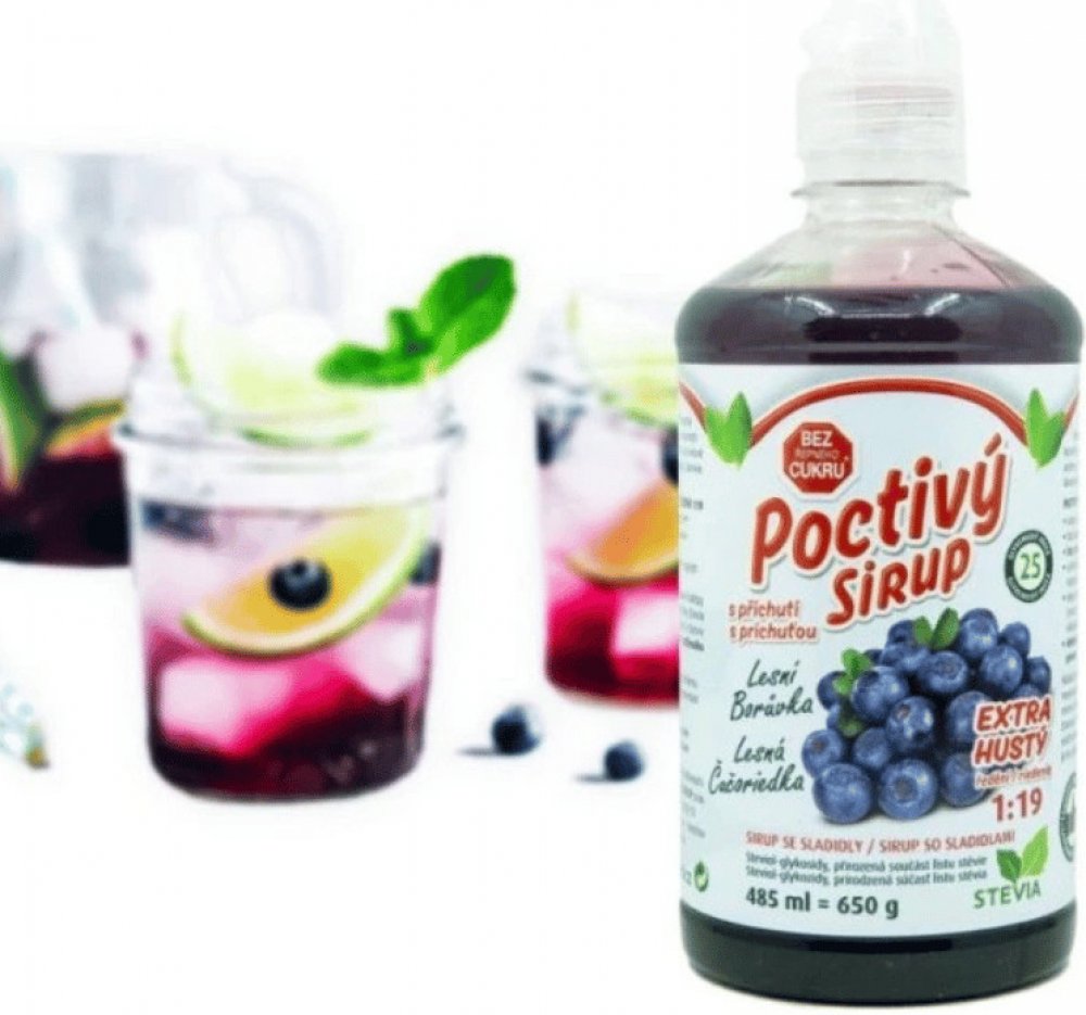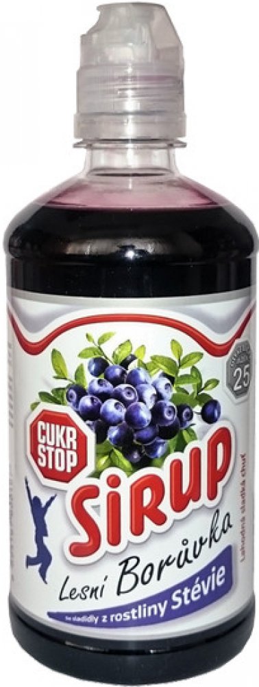 Složení: fruktóza, pitná voda, báze borůvka, regulátor kyselosti: kyselina citrónová, barvivo: rostlinný koncentrát, sladidla z rostliny Stévie