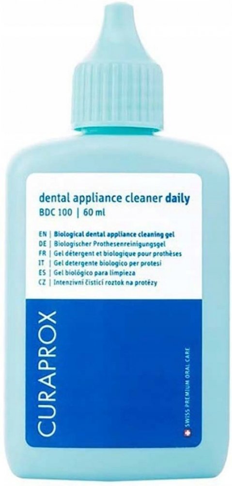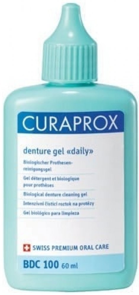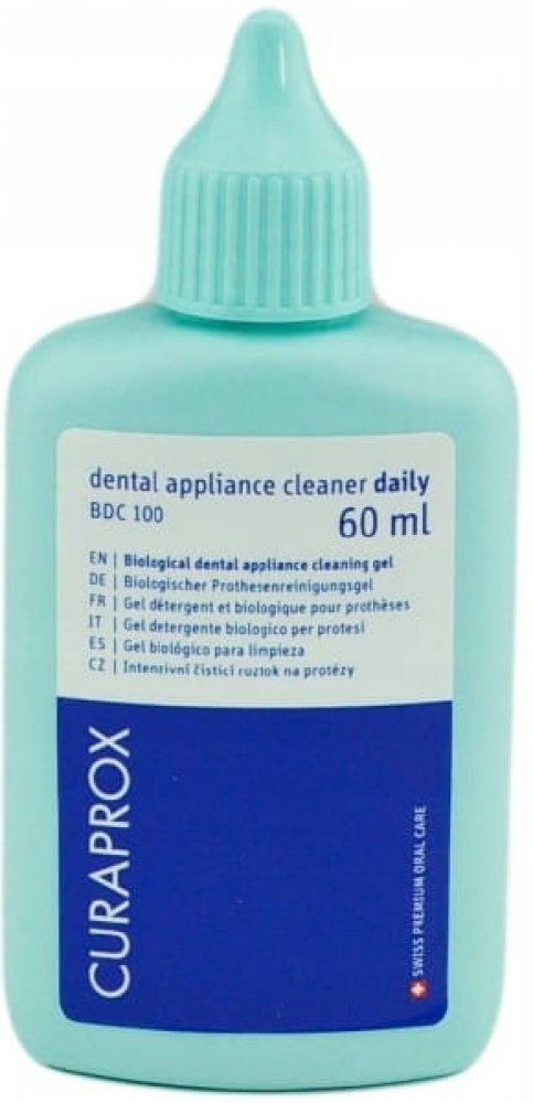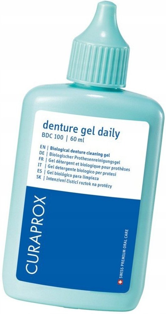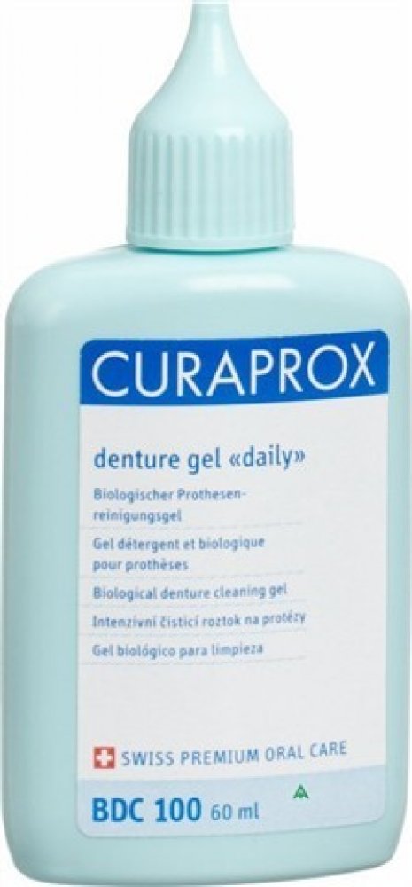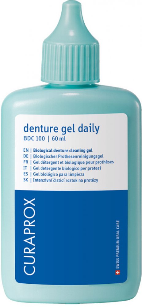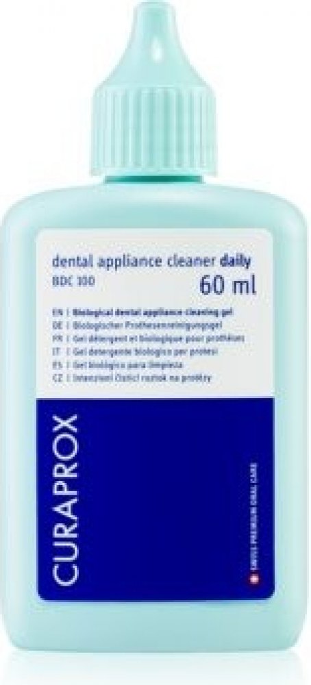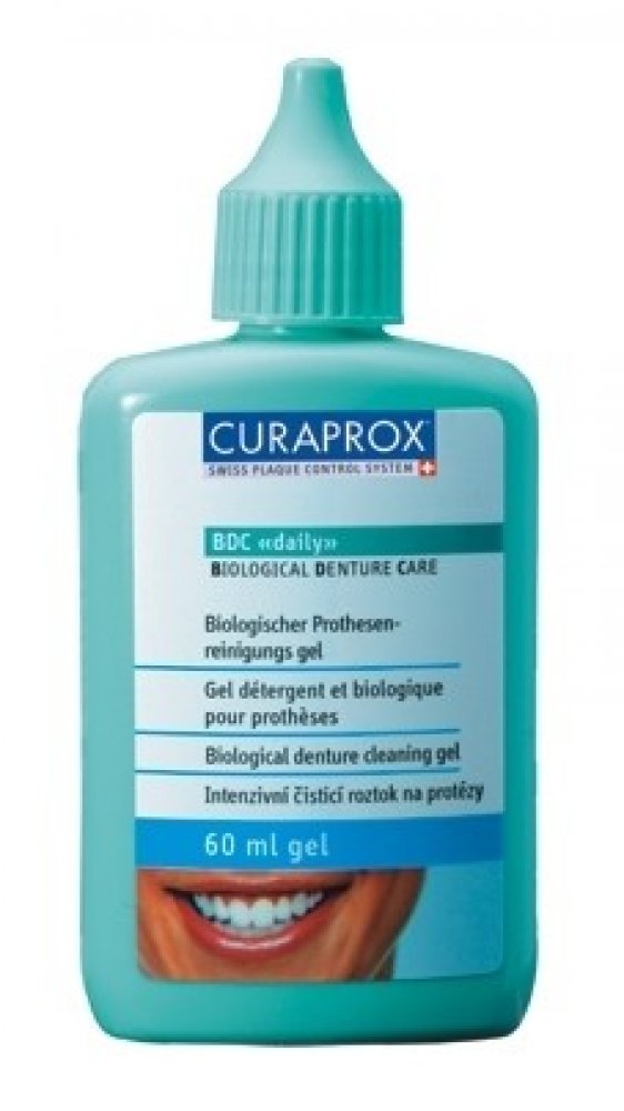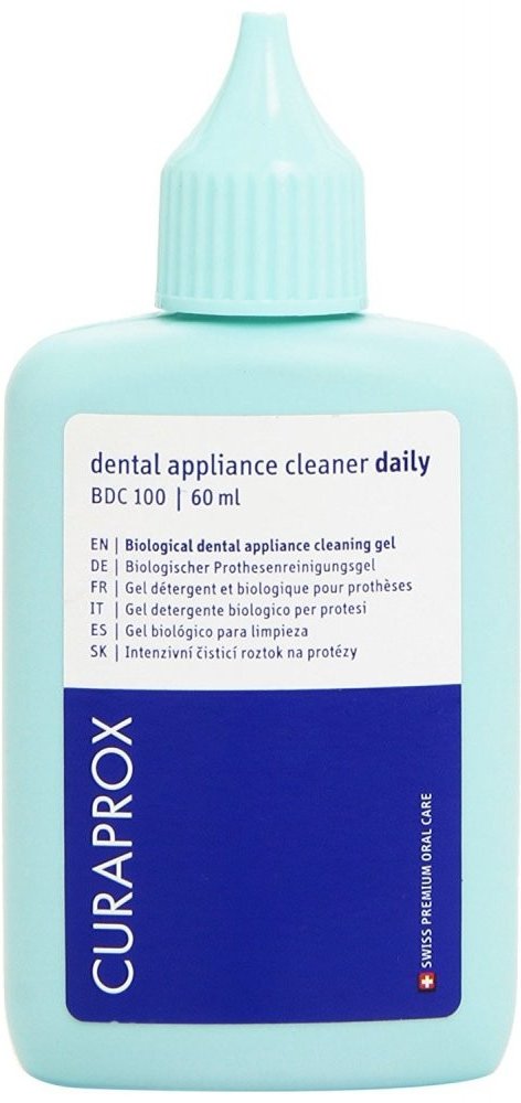 Curadent BDC 100 daily gel, nanáší se několik kapek gelu přímo na protézu, která se důkladně vyčistí kartáčkem na protézy.