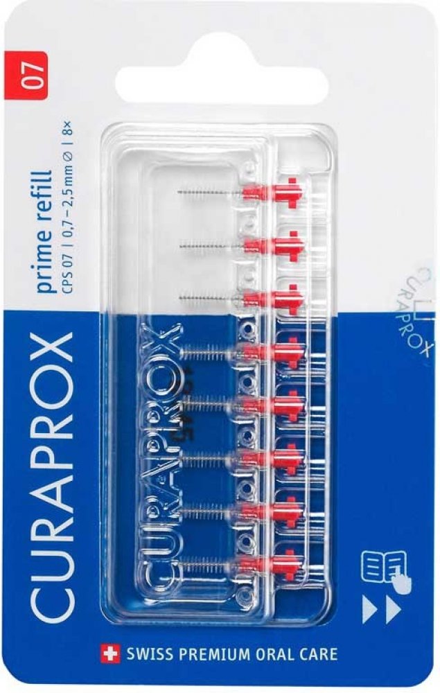 Náhradní kartáčky Curaprox CPS 07 Prime s jemným drátěným jádrem a štětinami vyplňujícími mezizubní prostory jsou klíčem k úspěšnému ošetření mezizubních prostor. Tyto ultra jemné, avšak zároveň pevné mezizubní kartáčky se hodí téměř do všech mezizubních prostor. Patentovaná ultrajemná vlákna Curen a tenký chirurgický drátek jsou zárukou, že nedojde k poškození dásně.