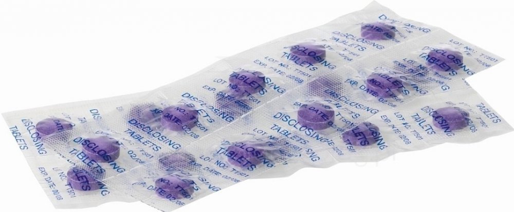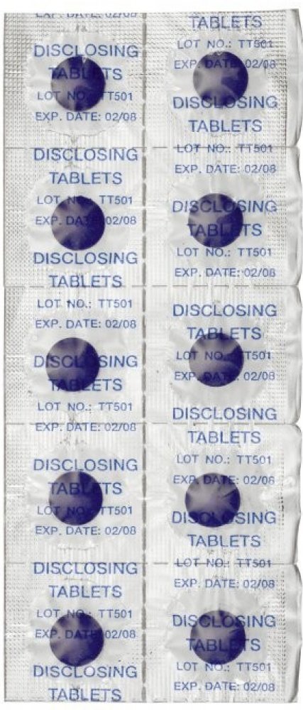 Použití: Vyčistěte si zuby, rozkousejte tabletu, vypláchněte vodou a zkontrolujte povrch skloviny. Zabarvená místa ukazují špatně vyčištěná místa.