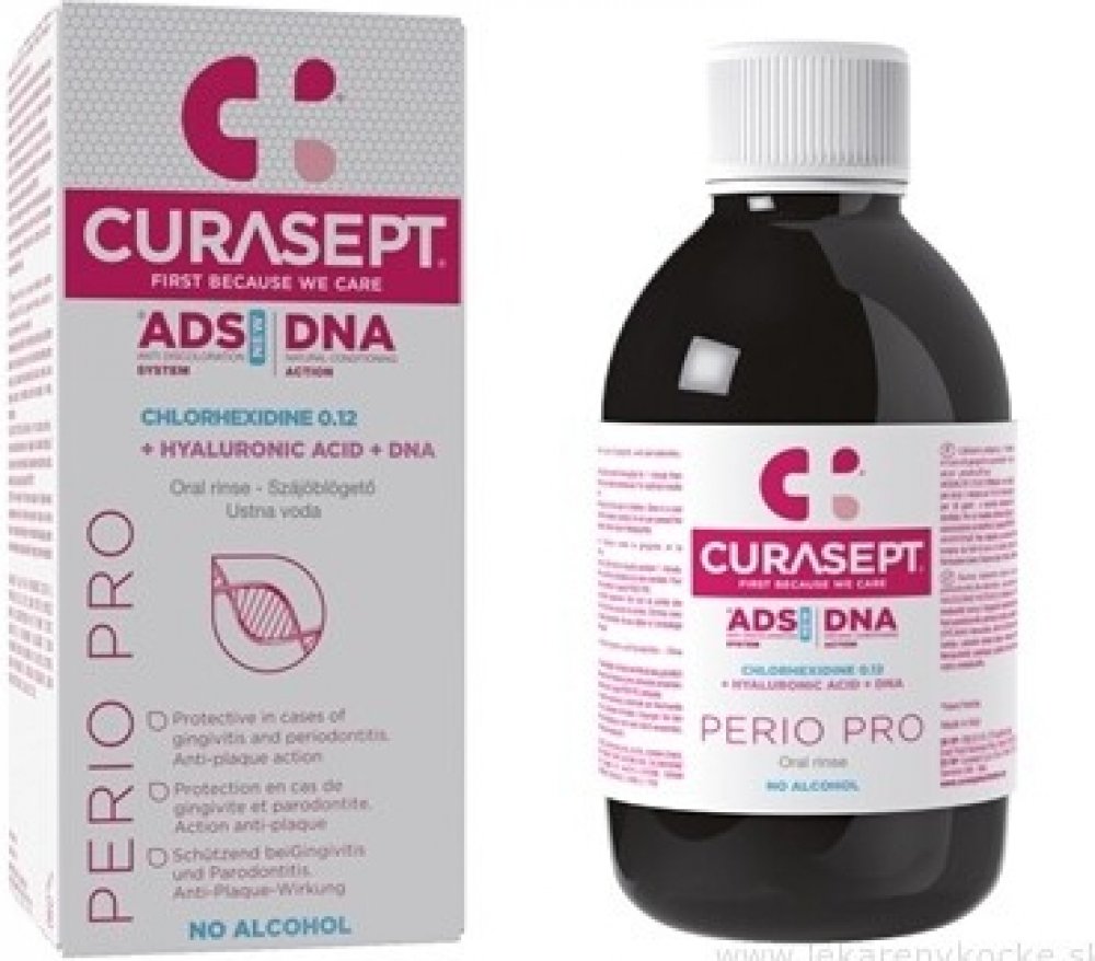 CURASEPT ADS DNA PERIO PRO je ústní voda s 0,12% chlorhexidinem, kyselinou hyaluronovou, která zvyšuje hydrataci sliznice a DNA, složkou podporující přirozenou regeneraci. Je vhodná k hygieně úst s po parodontologických a stomatologických ošetřeních. Působí proti zubnímu plaku a zároveň napomáhá zklidnění podrážděných sliznic a dásní. Patentovaný systém ADS® minimalizuje riziko zabarvení zubů způs...