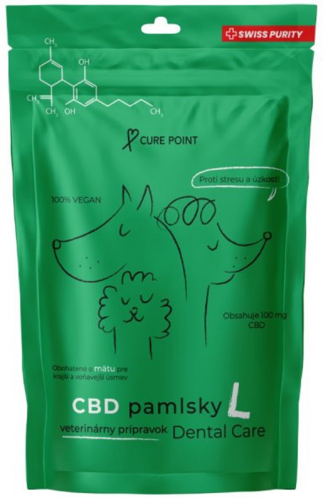 CBD pamlsky Dental Care od slovenské značky Cure Point jsou zdravým doplňkem stravy pro psy. Díky kombinaci máty a CBD pamlsky nejen podporují dentální hygienu a svěží dech, ale také můžou pomoct při stresu, zlepšují trávení a předcházejí žaludečním potížím. Složení je 100% veganské a zahrnuje brokolici, dýni, špenát a arašídové máslo, což zaručuje lahodnou chuť, kterou si váš mazlíček zamiluje. P...