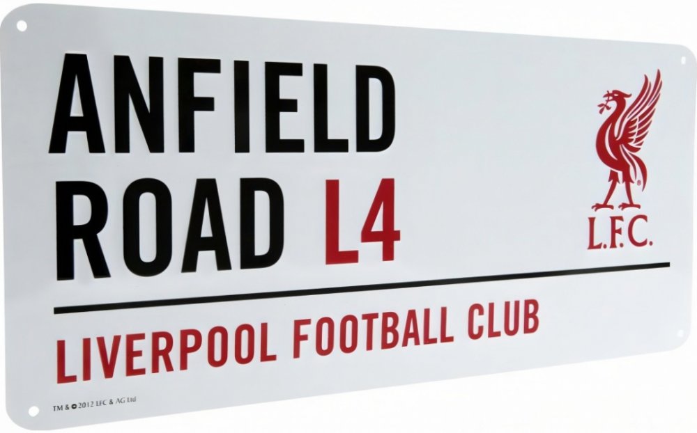 Plechová cedule Liverpool FC v bílé barvě. Černý nápis Anfield Road L4 odkazuje na domácí stadion tohoto fotbalového klubu. Ve spodní části červeně vyvedený název klubu. Lakování dodává ceduli neotřelý design. Rozměr cedule: 40x18 cm. Čtyři předvrtané díry pro snadné uchycení.