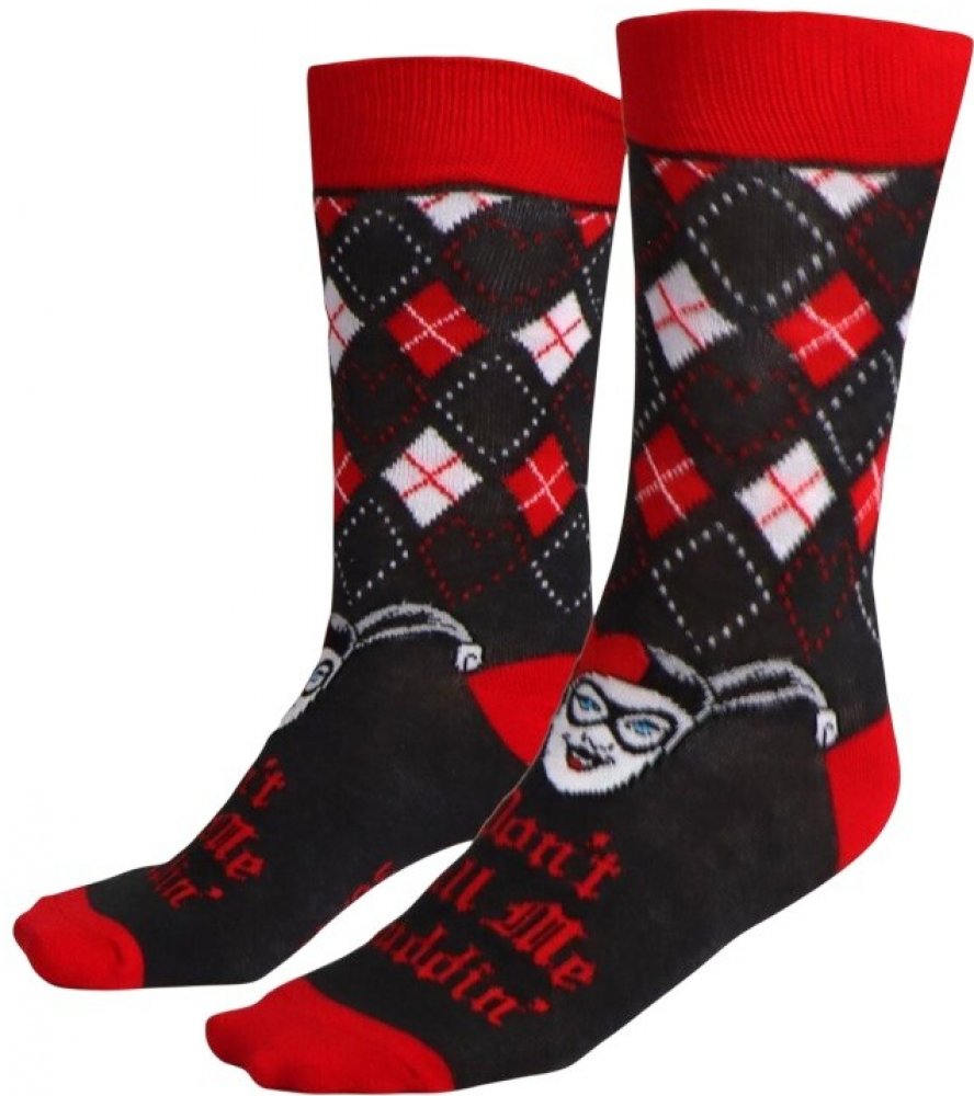 Stylové dámské ponožky s motivem ikonické komiksové antihrdinky Harley Quinn ze světa DC Comics. Kombinace červené a černé barvy spolu s výrazným designem dodá vašemu outfitu hravý a originální nádech. Ponožky jsou příjemné na nošení a skvěle se hodí na každodenní použití doma, do práce i na volný čas. Ideální doplněk pro všechny fanoušky Harley Quinn, kteří chtějí ukázat svou oblíbenou postavu i v detailech svého stylu.