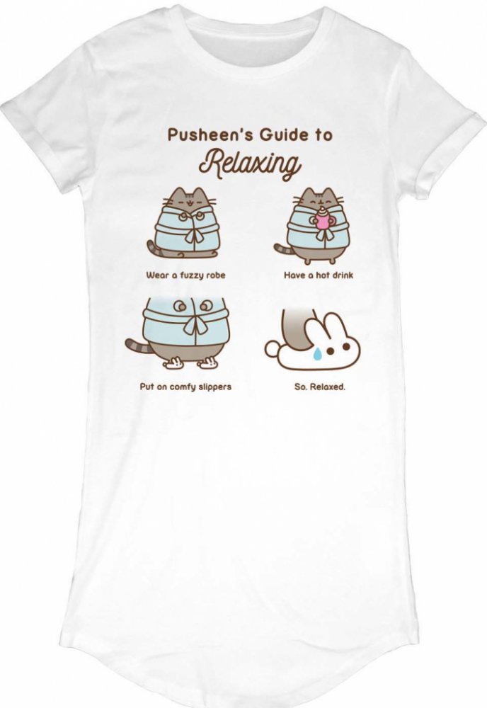Bílé dámské tričko inspirované grafikou kočky jménem Pusheen a nápisem Pusheen's Guide to Relaxing.