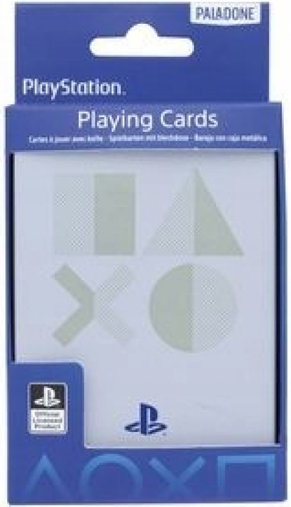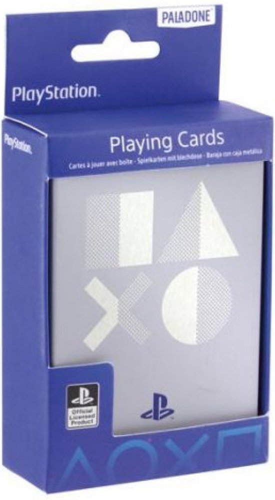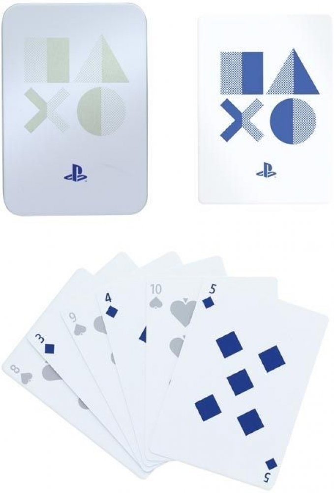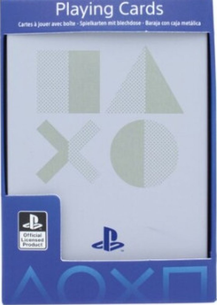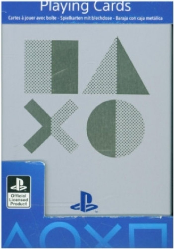 Hrací karty s motivem symbolů a znaků ovladače Playstation. Karty jsou zabaleny v plechové krabičce.