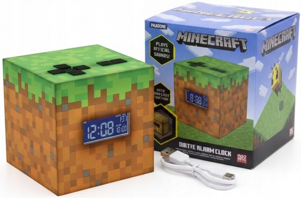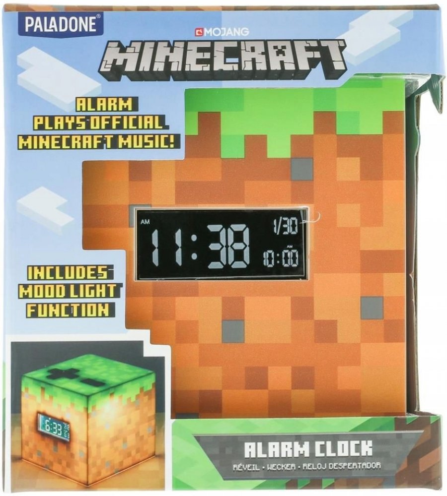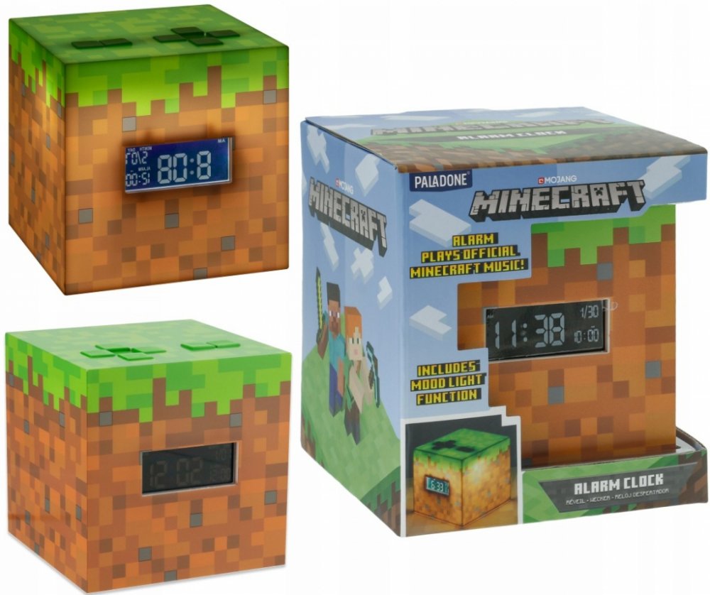 Budík ve tvaru Grass Blocku vás probudí zvukem hudby Minecraft Sunrise. Navíc funguje také jako noční lampička.