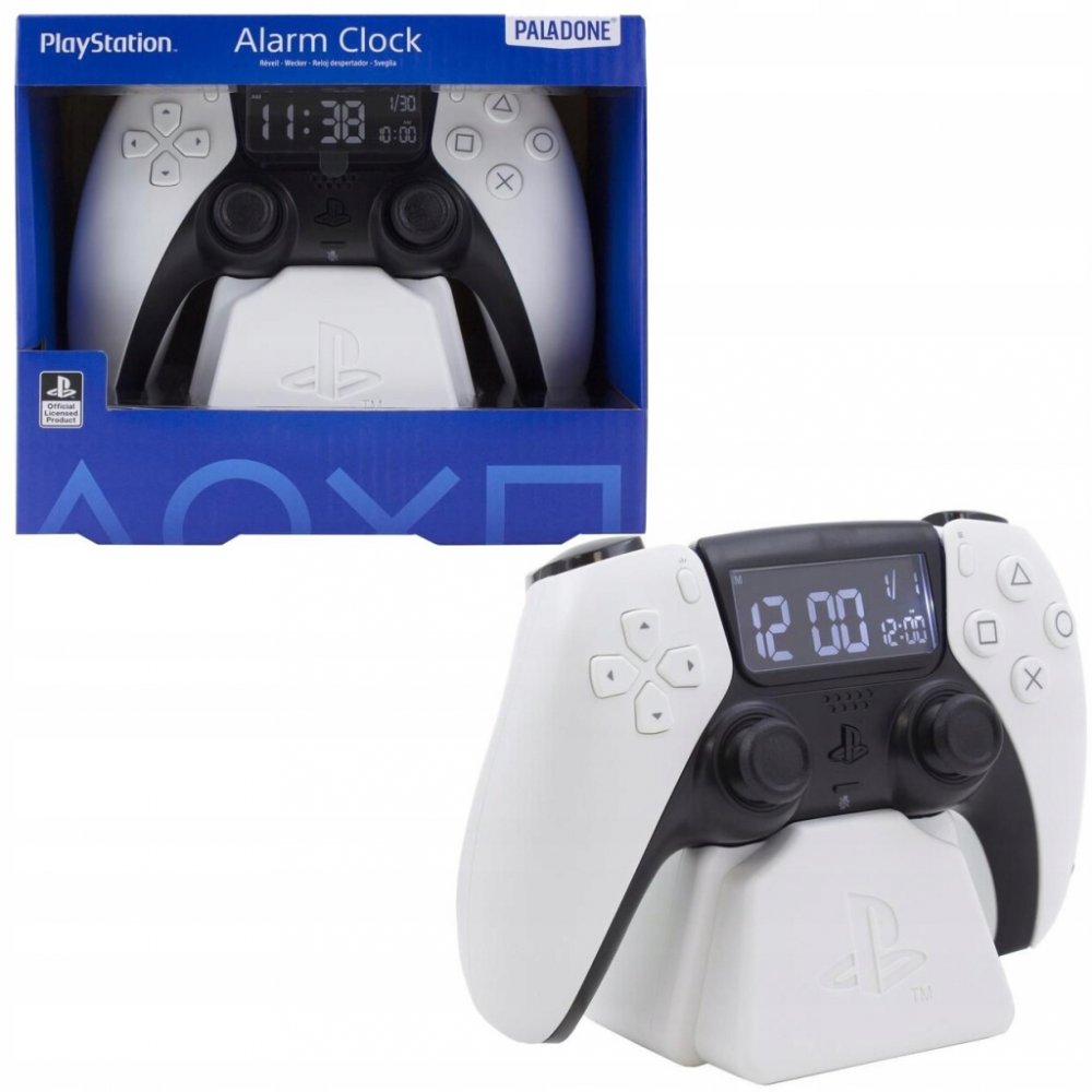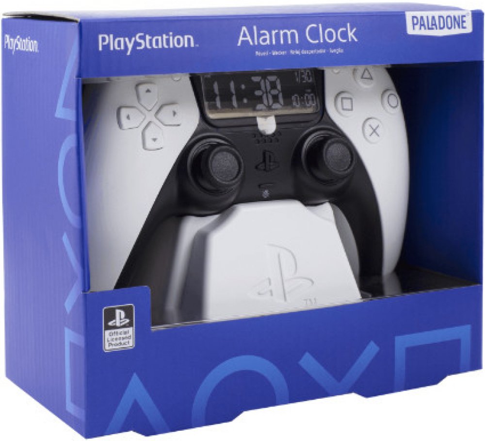 Bílý budík o šířce 15,8 cm (6,2") je navržen tak, aby připomínal ovladač PlayStation 5 DualSense. Obsahuje LCD digitální displej. Pomocí D-padu a tlačítek ovladače nastavte čas, datum a budík a aktivujte funkce snooze.