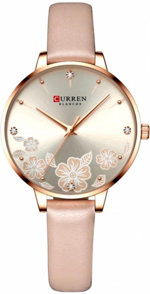 Dámské hodinky Curren Blume představují dokonalou kombinaci elegance a ženskosti. Ciferník zdobí jemné květinové vzory a třpytivé zirkony, které dodávají hodinkám luxusní vzhled. Řemínek z kvalitní ekologické kůže poskytuje pohodlí při nošení a zároveň oživuje celkový design. Ideální pro každodenní nošení i speciální příležitosti, tyto hodinky jsou nepřehlédnutelným módním doplňkem, který podtrhne vaši jedinečnost.