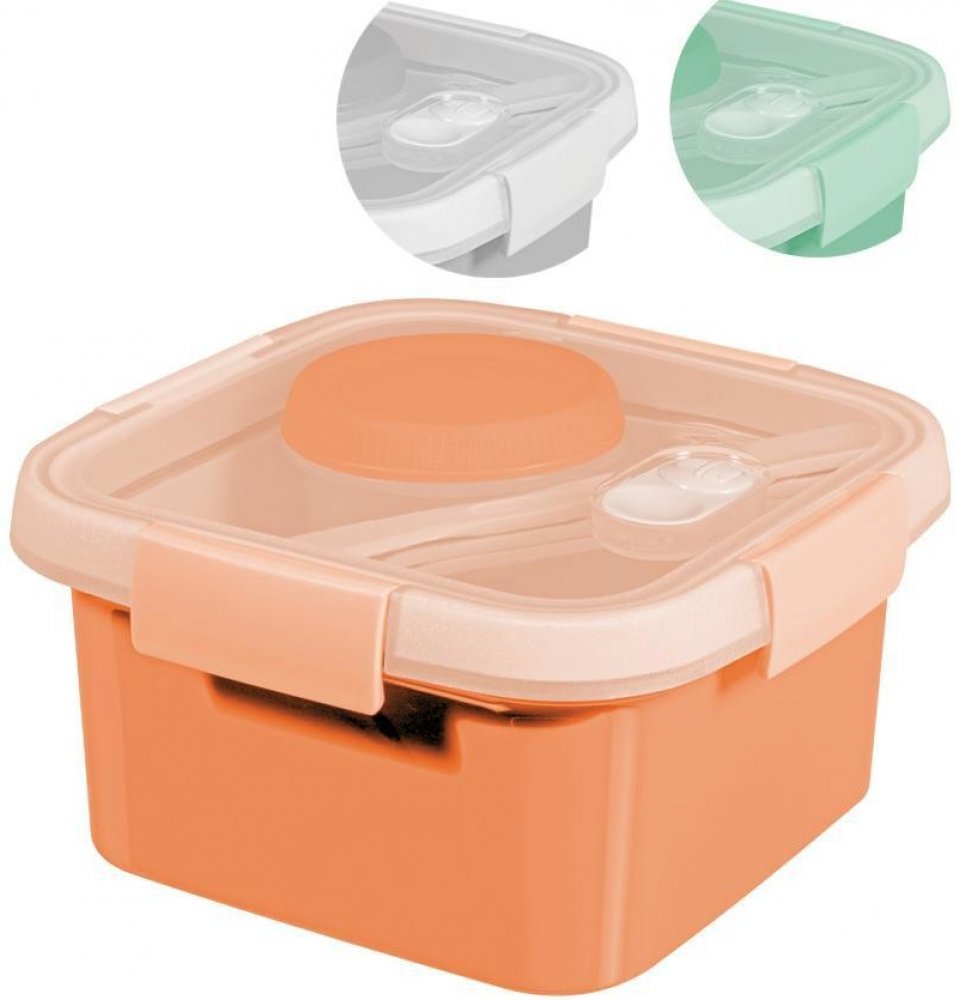 Vzduchotesný obedár s objemom 1,1 l obsahuje podnos, misku na omáčku a súpravu príboru s vidličkou, nožom a lyžicou. Táto kompaktná dóza sa ľahko zmestí do tašky alebo je vhodná na prenášanie na cestách a je vyrobená zo 100% recyklovaného polypropylénu. Obsahuje parný ventil na veku pre lepší ohrev v mikrovlnke. Vhodné do mikrovlnnej rúry, umývačky riadu, chladničky a mrazničky. Výber farby (mint, sivá alebo broskyňová) nie je možné ovplyvniť. Objem: 1,1 litra. Rozmery: 16x16x9 cm.