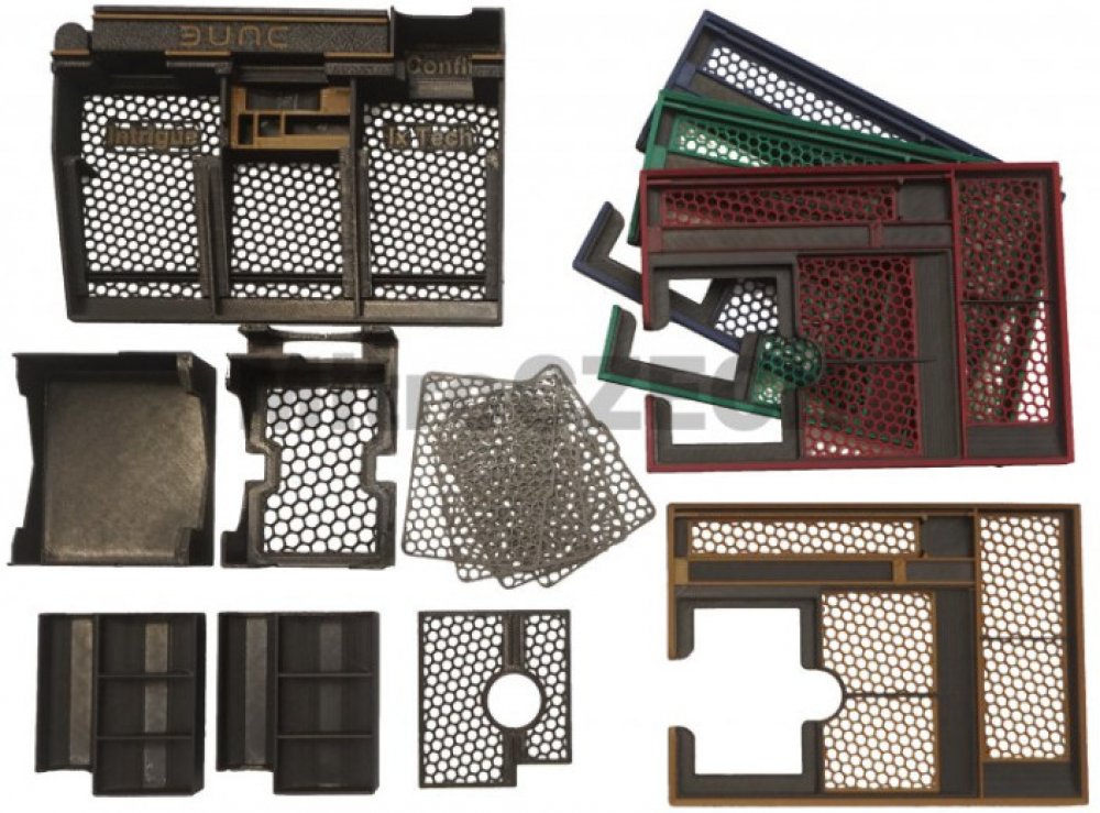 Velmi povedený plastový pořadač pro Dunu i s oběma expanzemi, který obsahuje stojánky na karty, podložky pod hráčské desky a spoustu dalších hezkých detailů, 3d tisk.